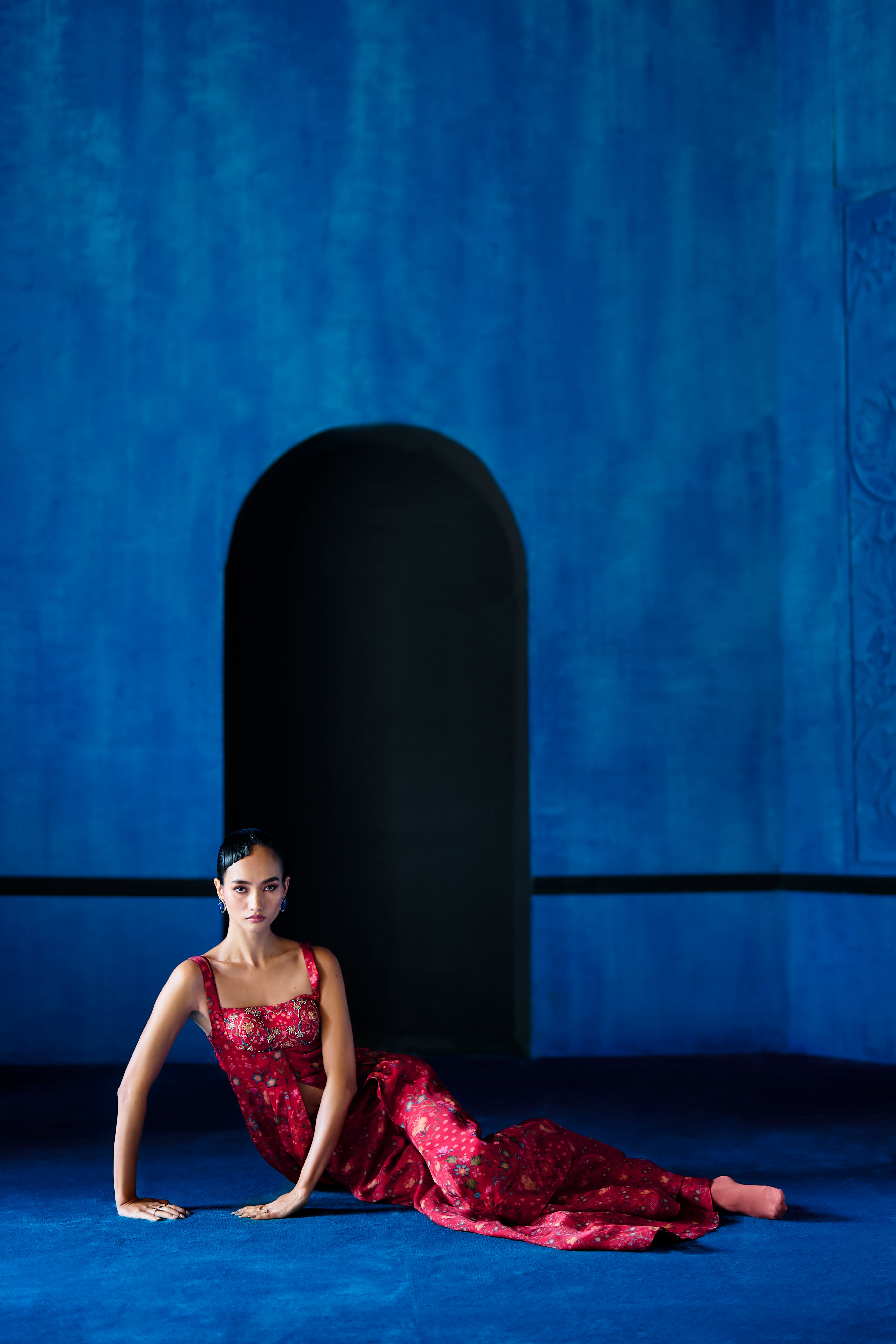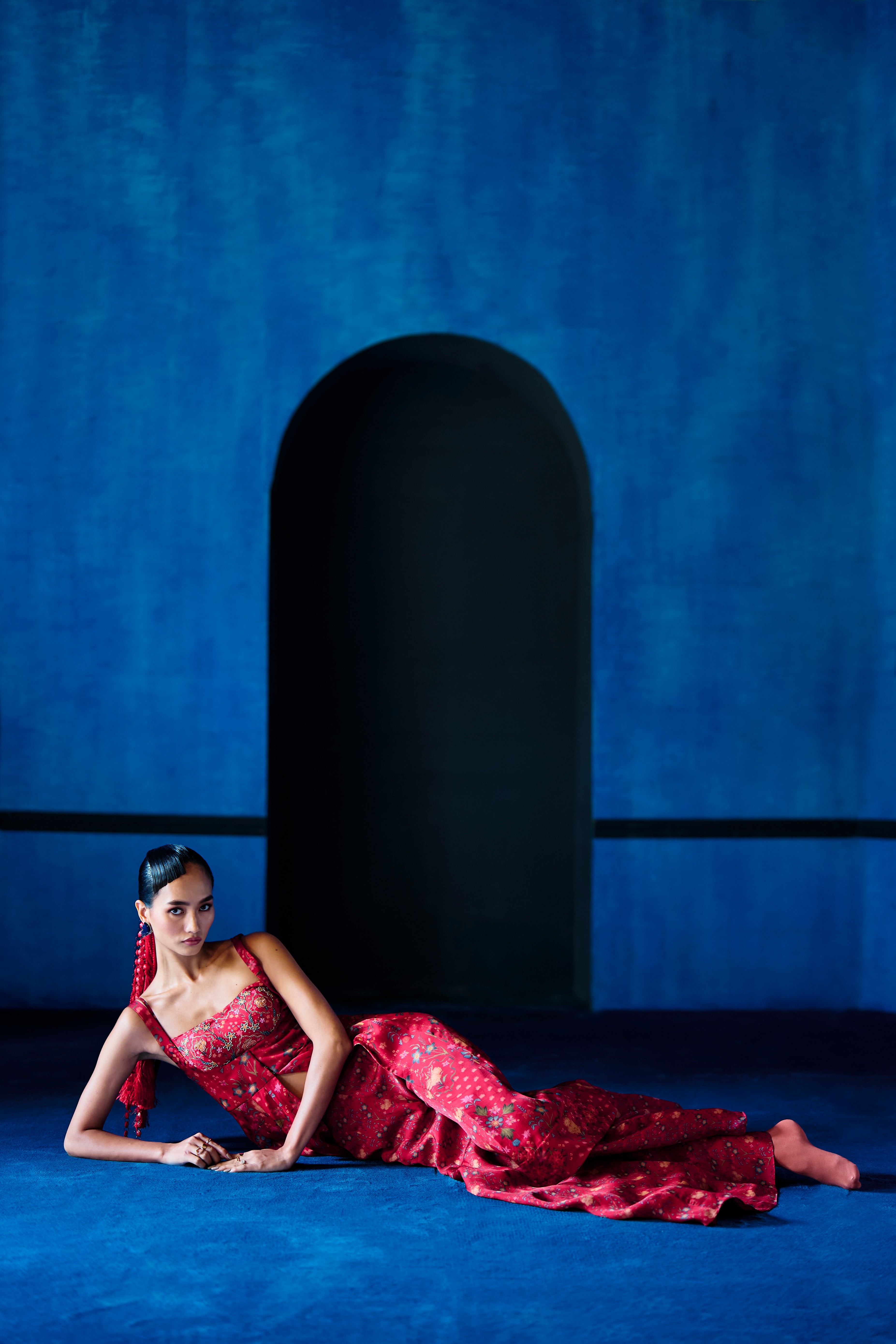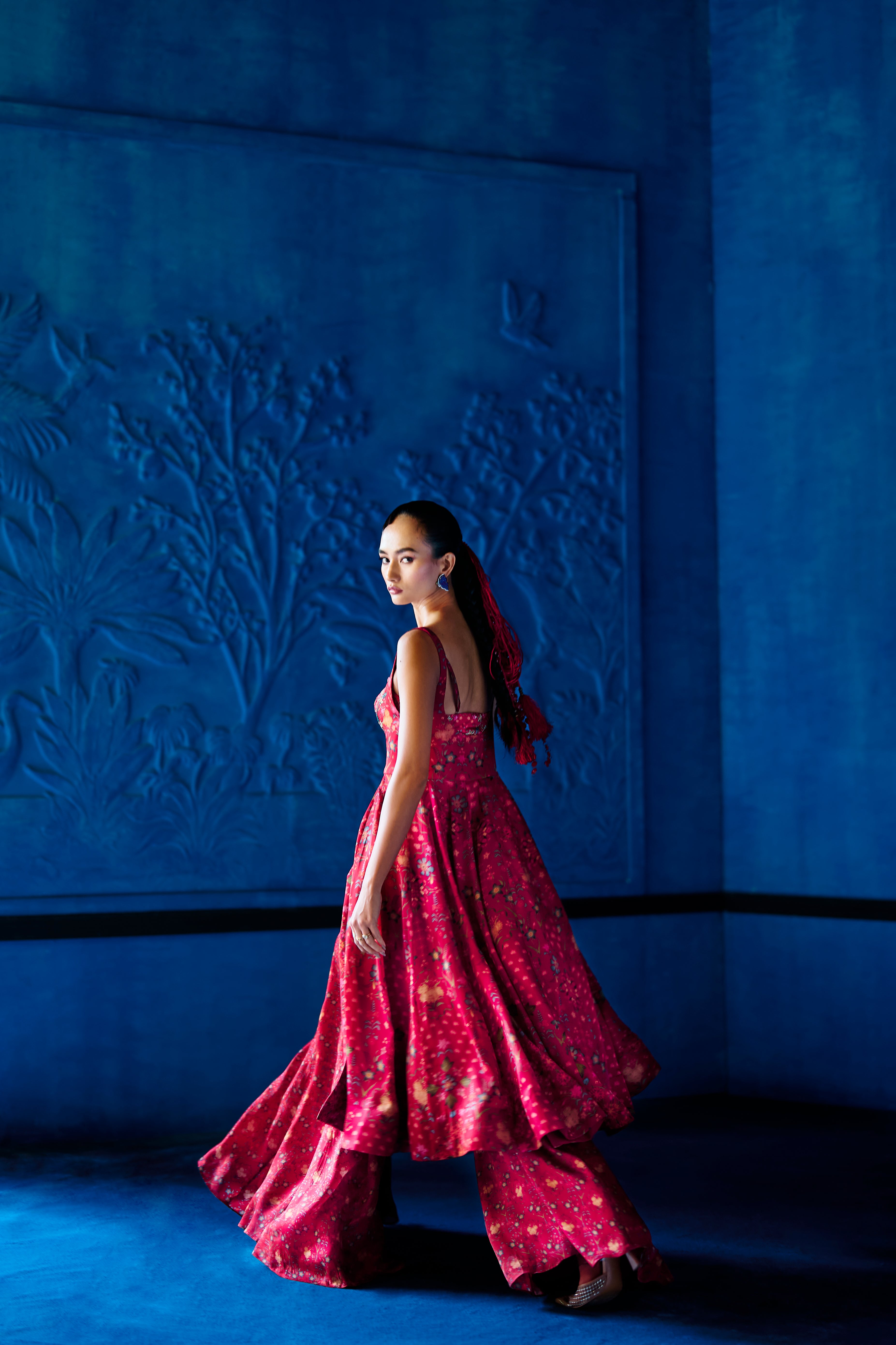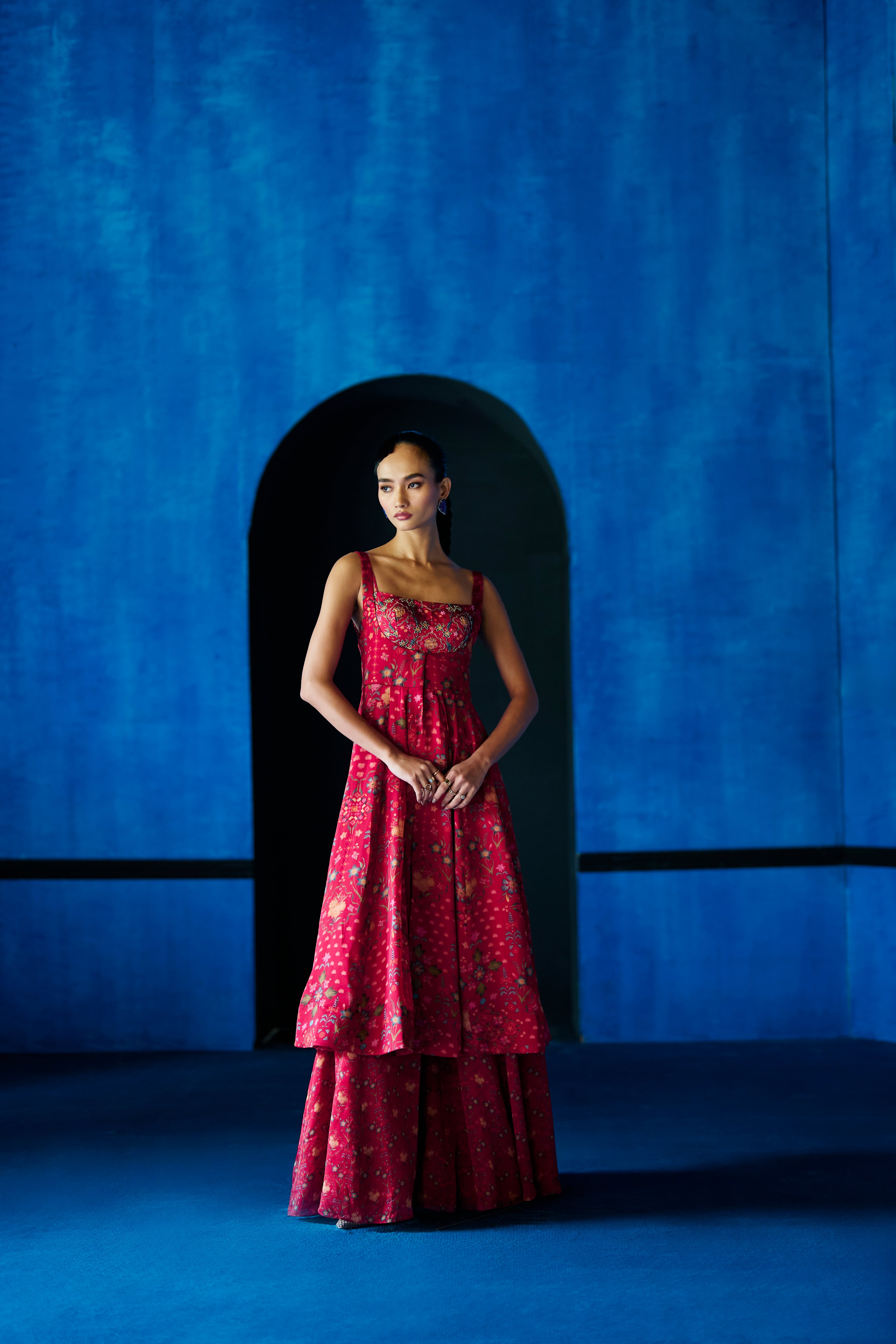 Red floral printed Satin Organza Anarkali with embroidered bustier with delicate straps complemented by matching floral printed sharara pants.