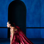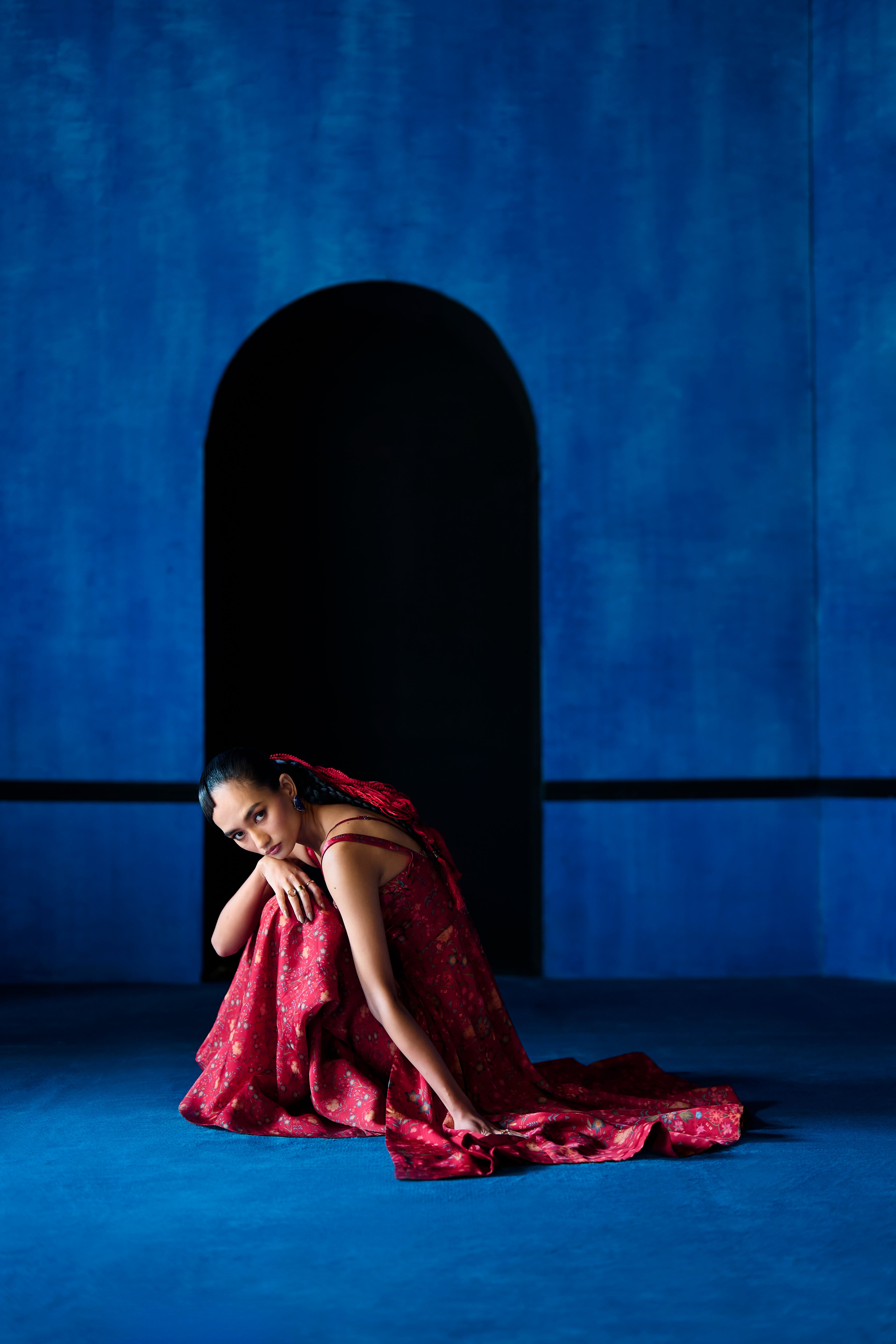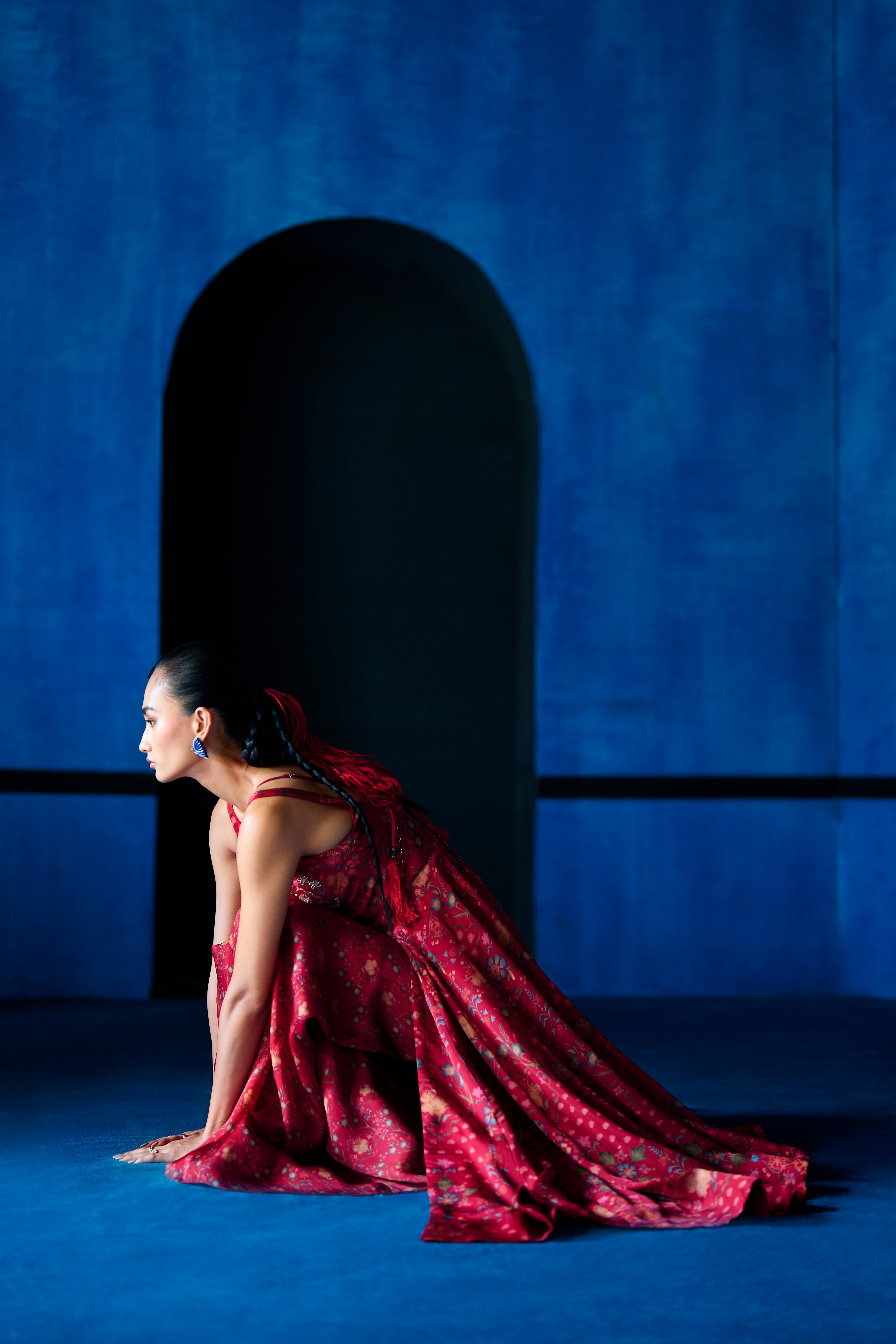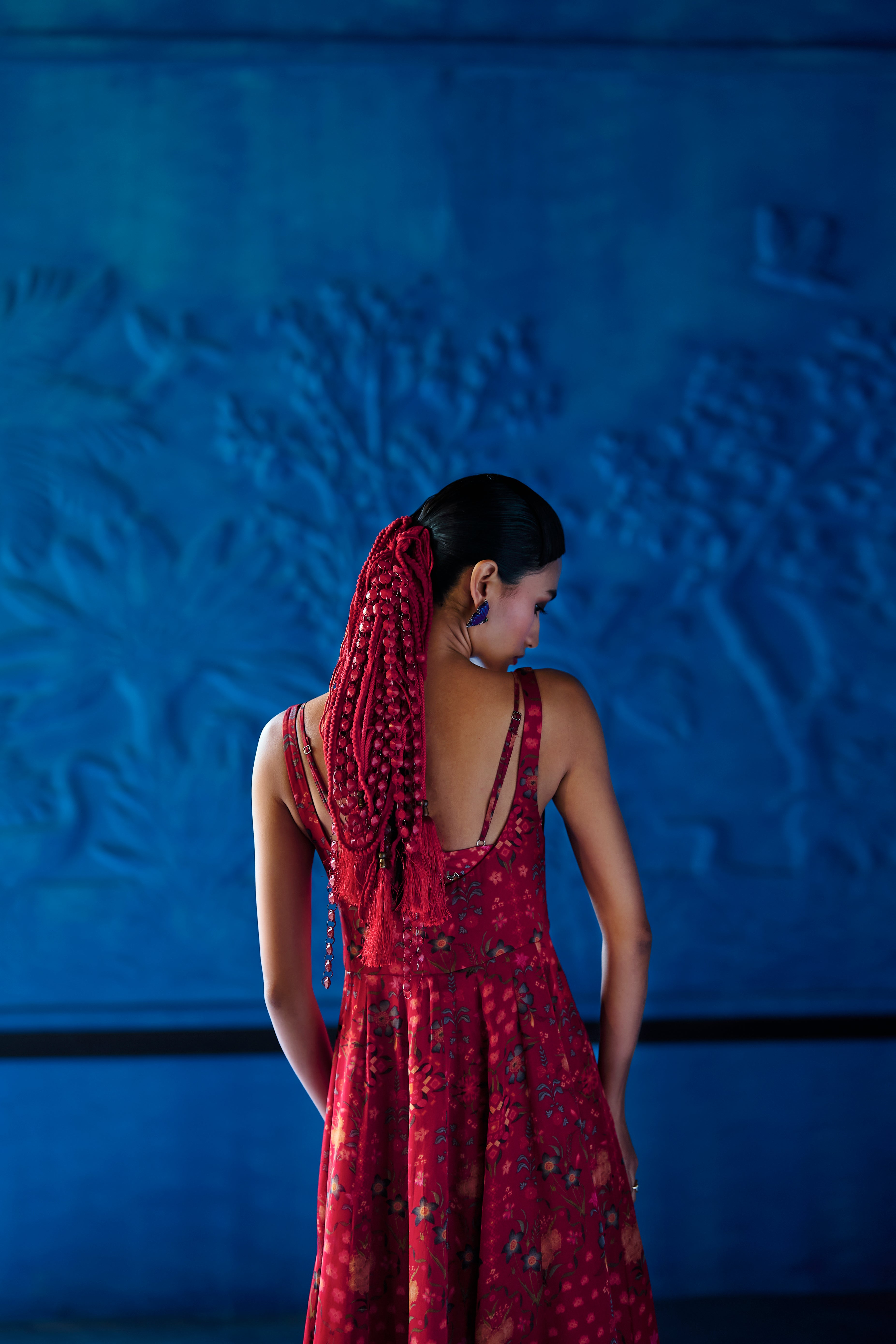 Red floral printed Satin Organza Anarkali with embroidered bustier with delicate straps complemented by matching floral printed sharara pants.