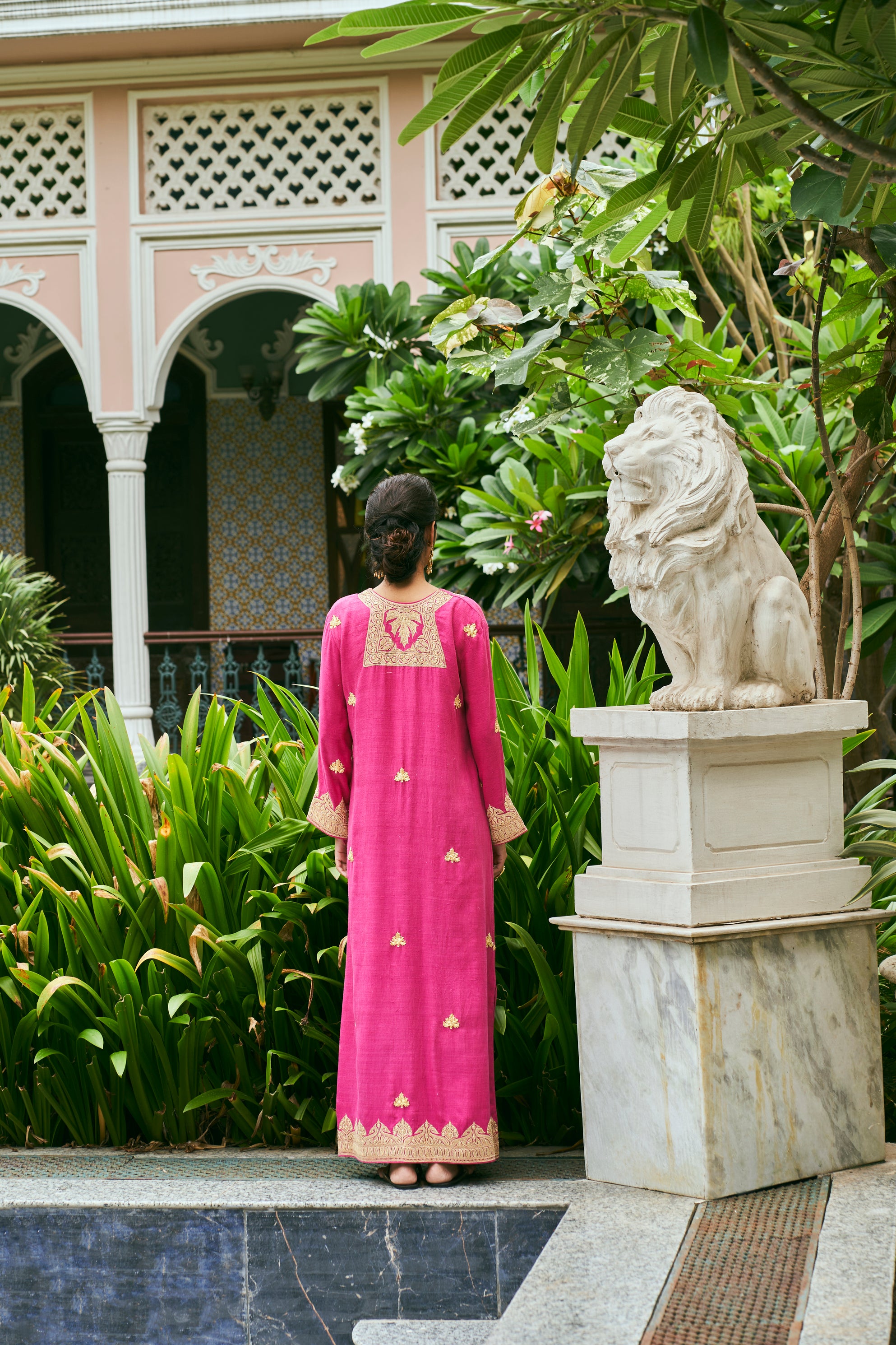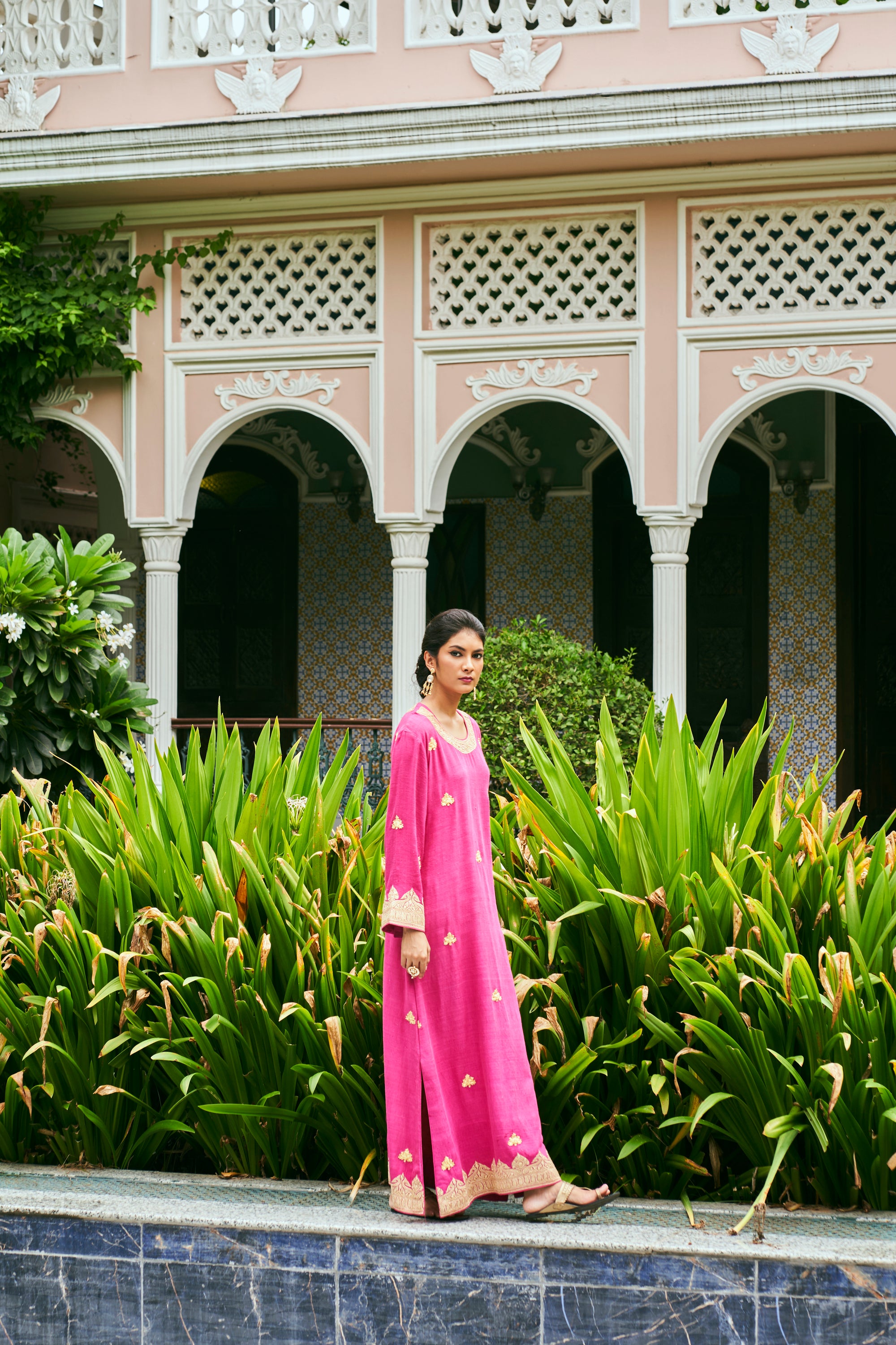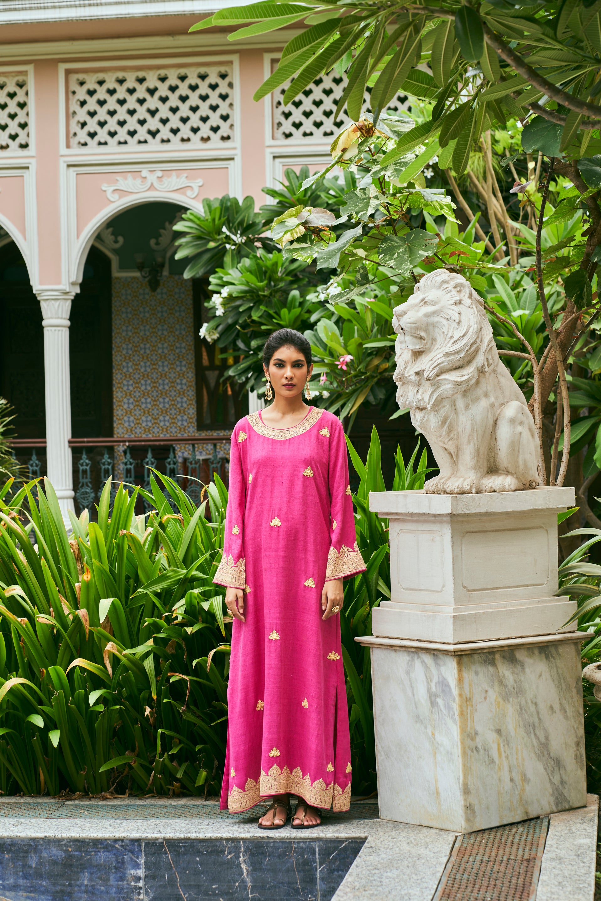 ‘Roosa’ Gulabi Kaftan crafted from luxurious Matka Silk features hand embroidered traditional Chinar Motif all-over, complemented by similar hand embroidered chinar motif design at neck, border and sleeves.