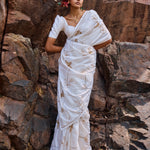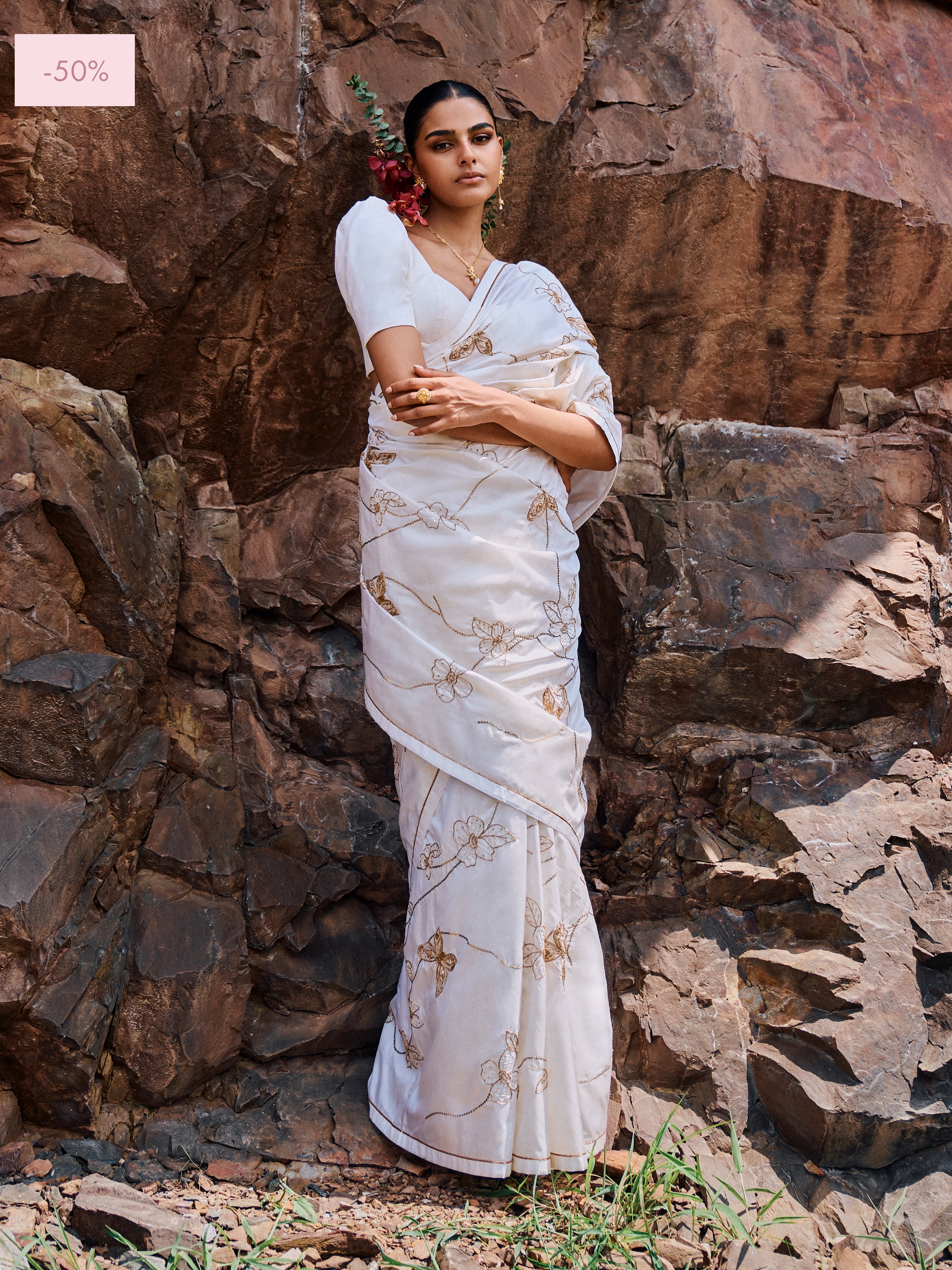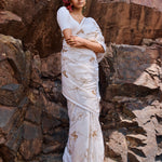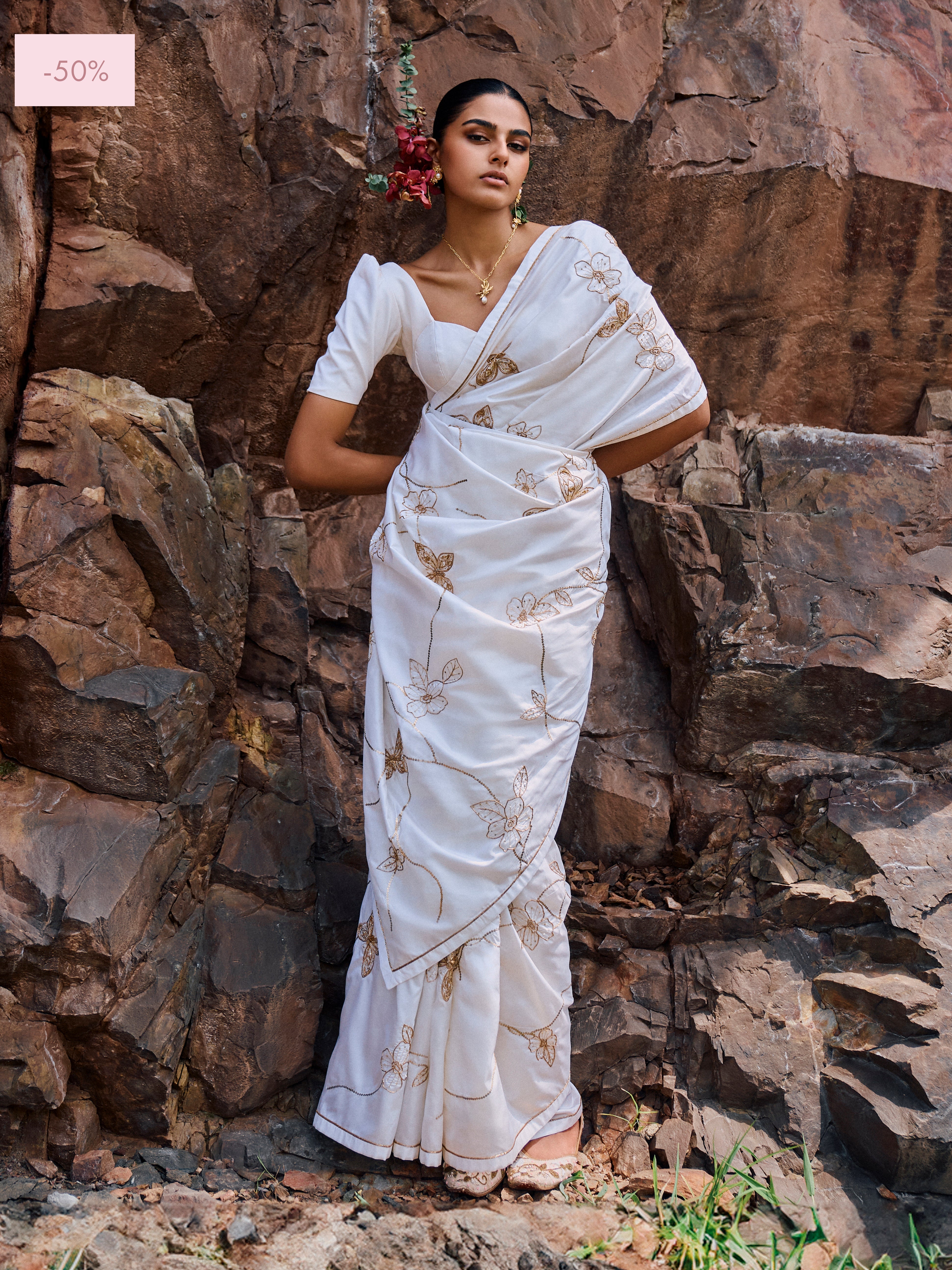 'Sikhiri' White sari features Hand Embroidered border with Golden Butterfly design as Jaal placement all over and is paired with puff sleeves pure silk blouse.