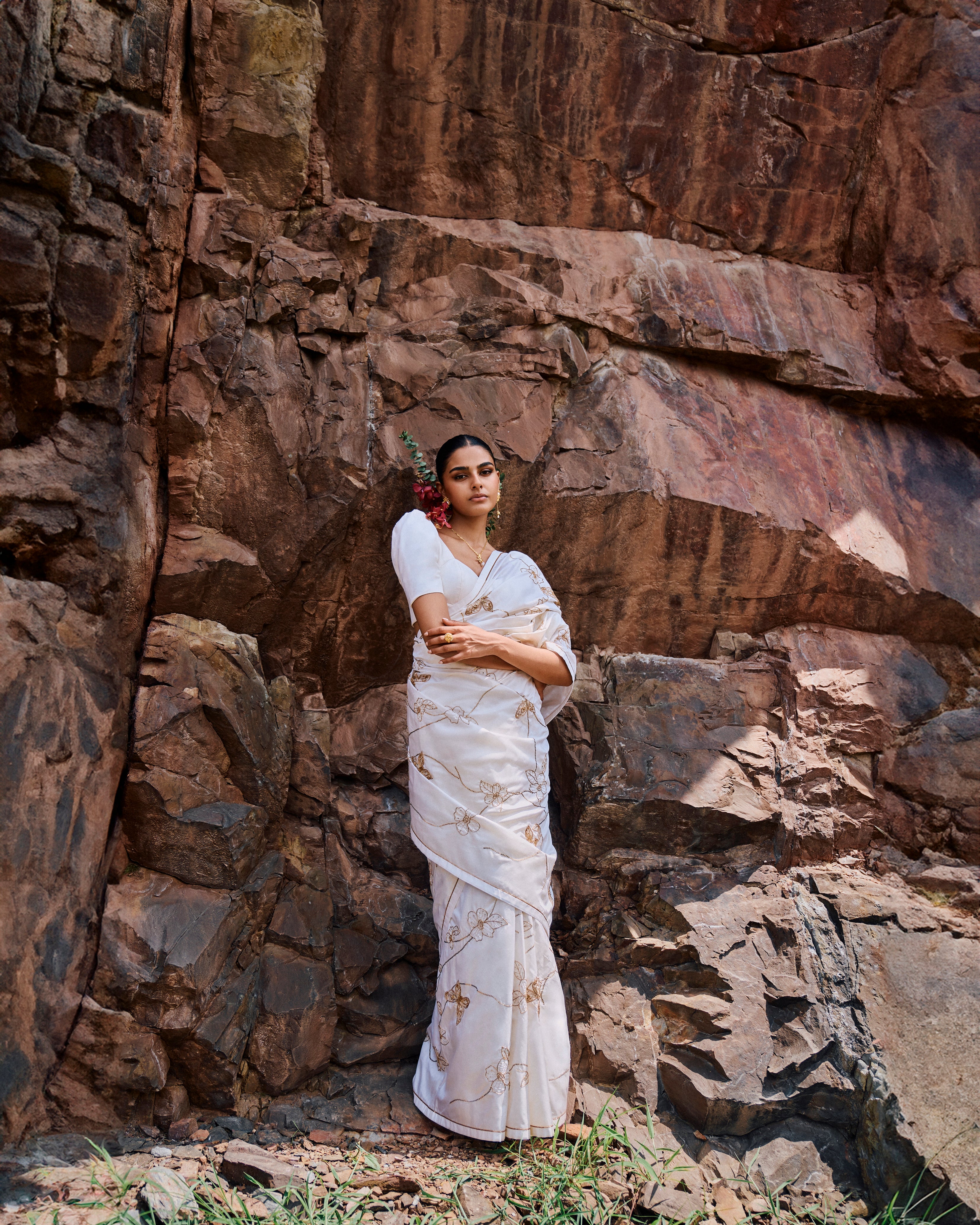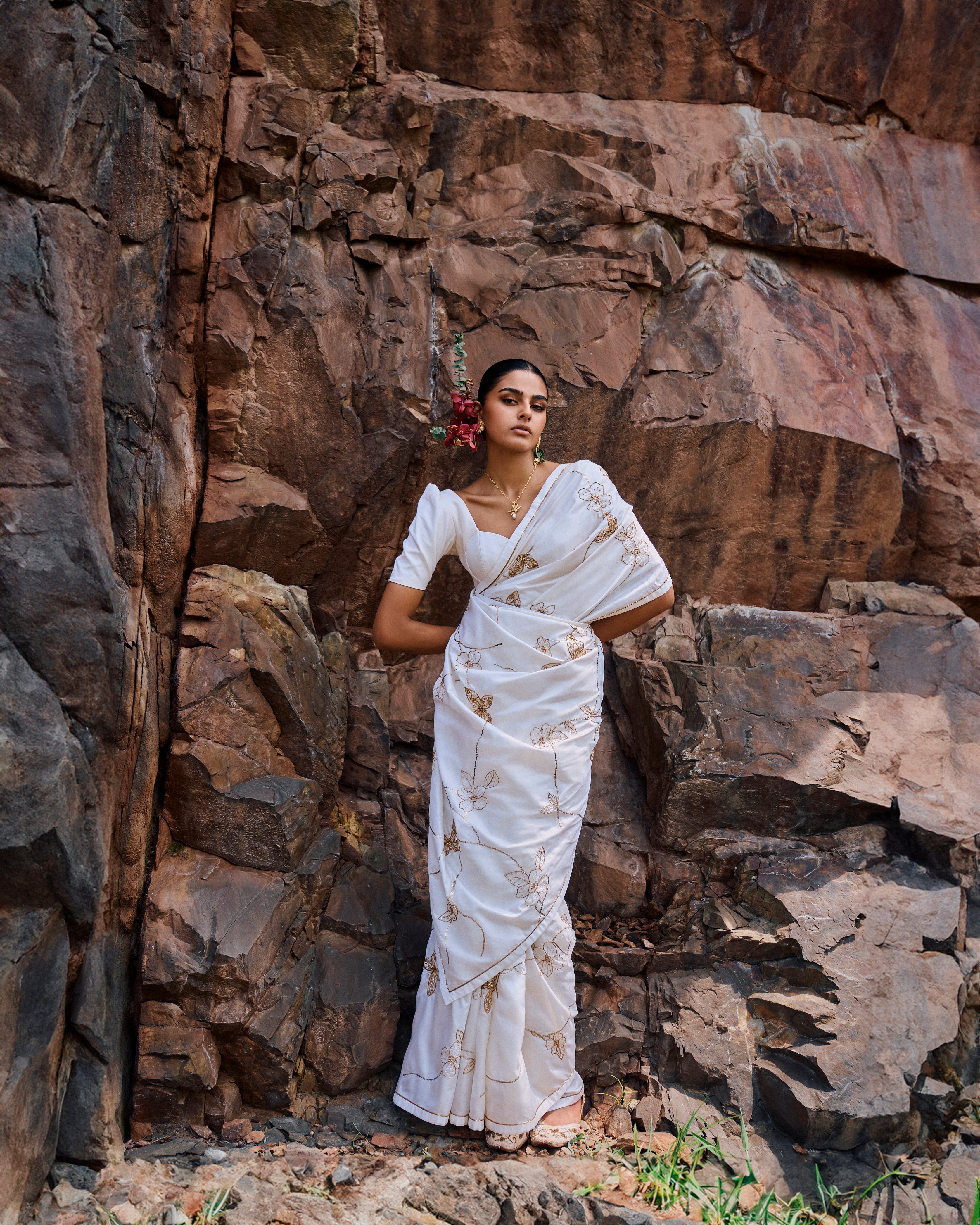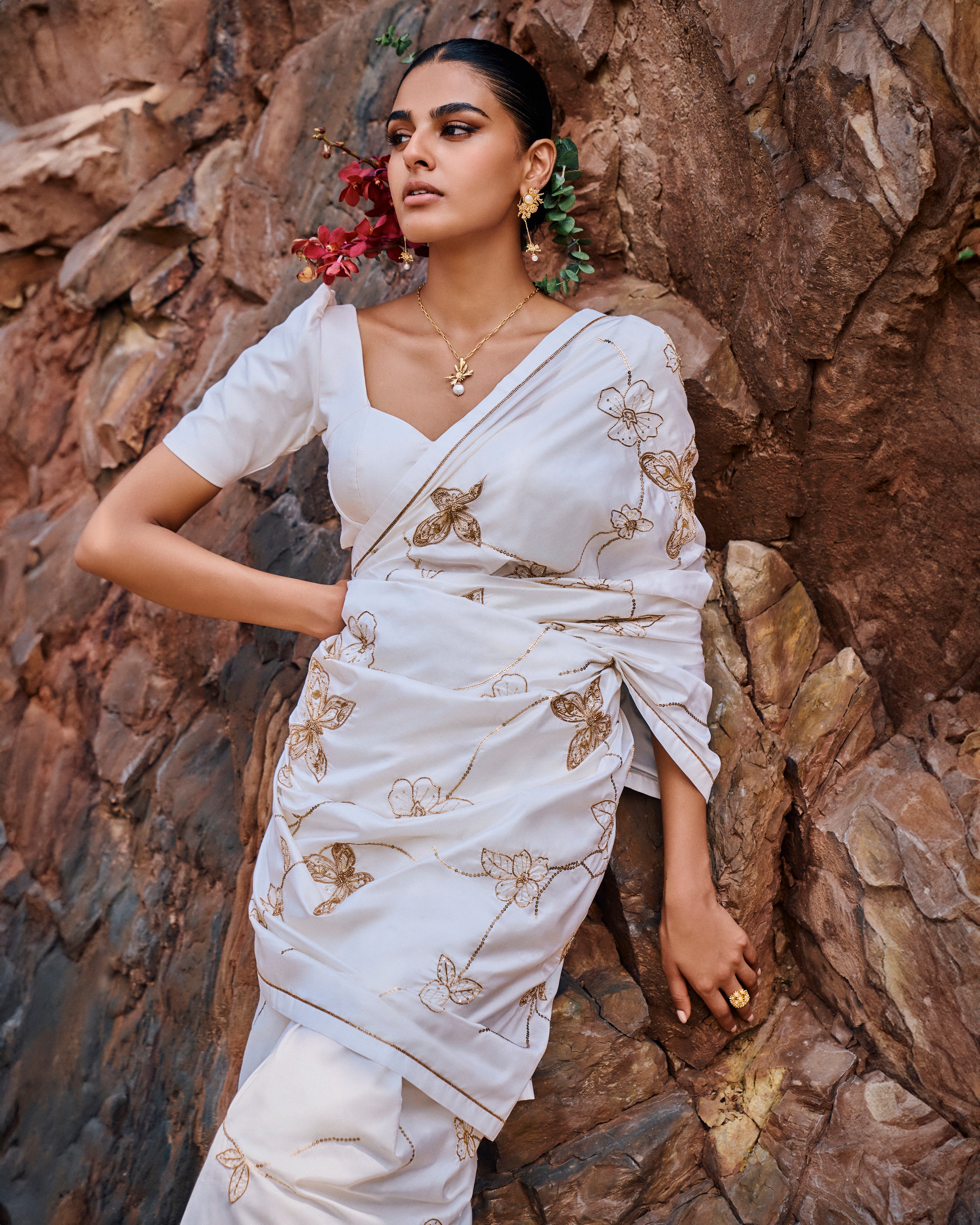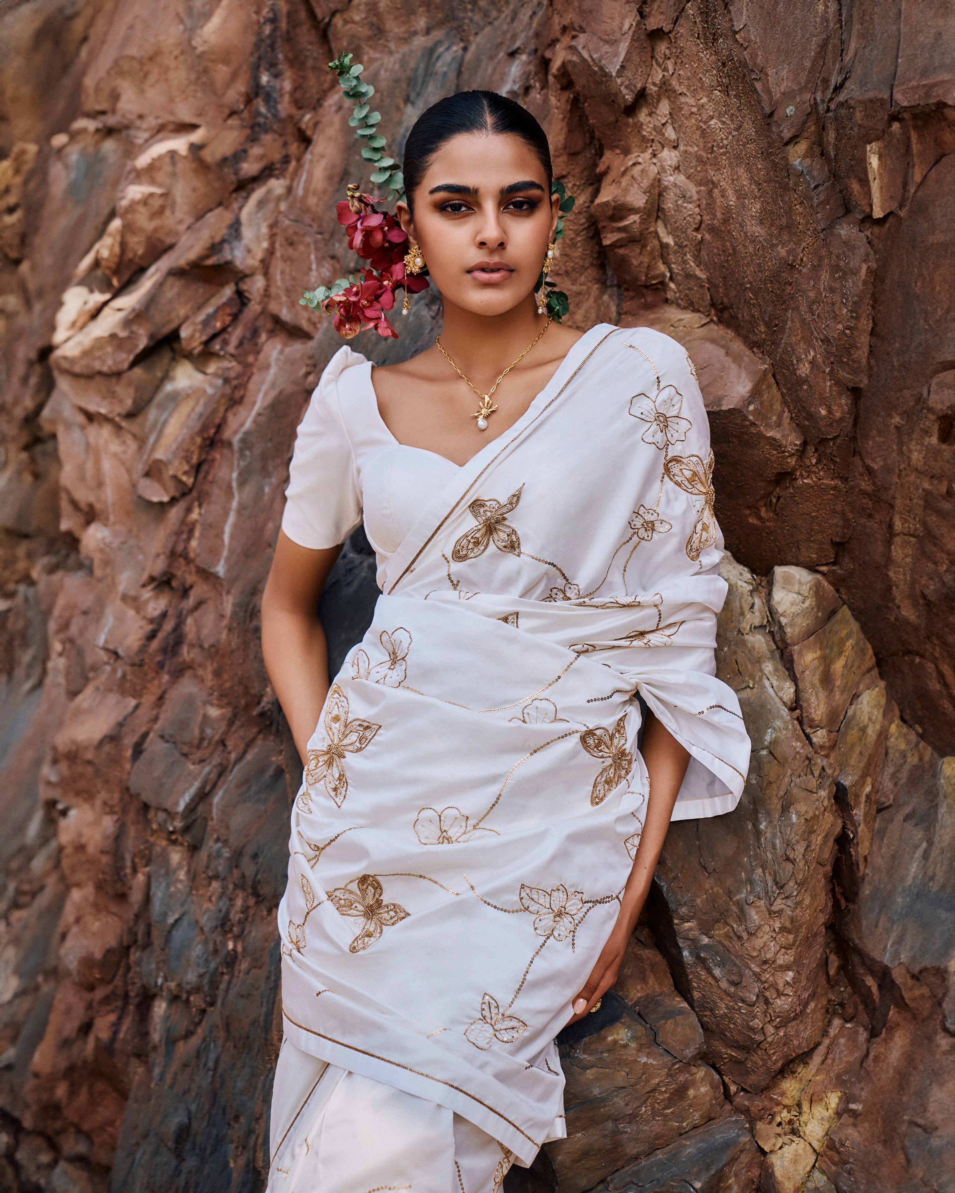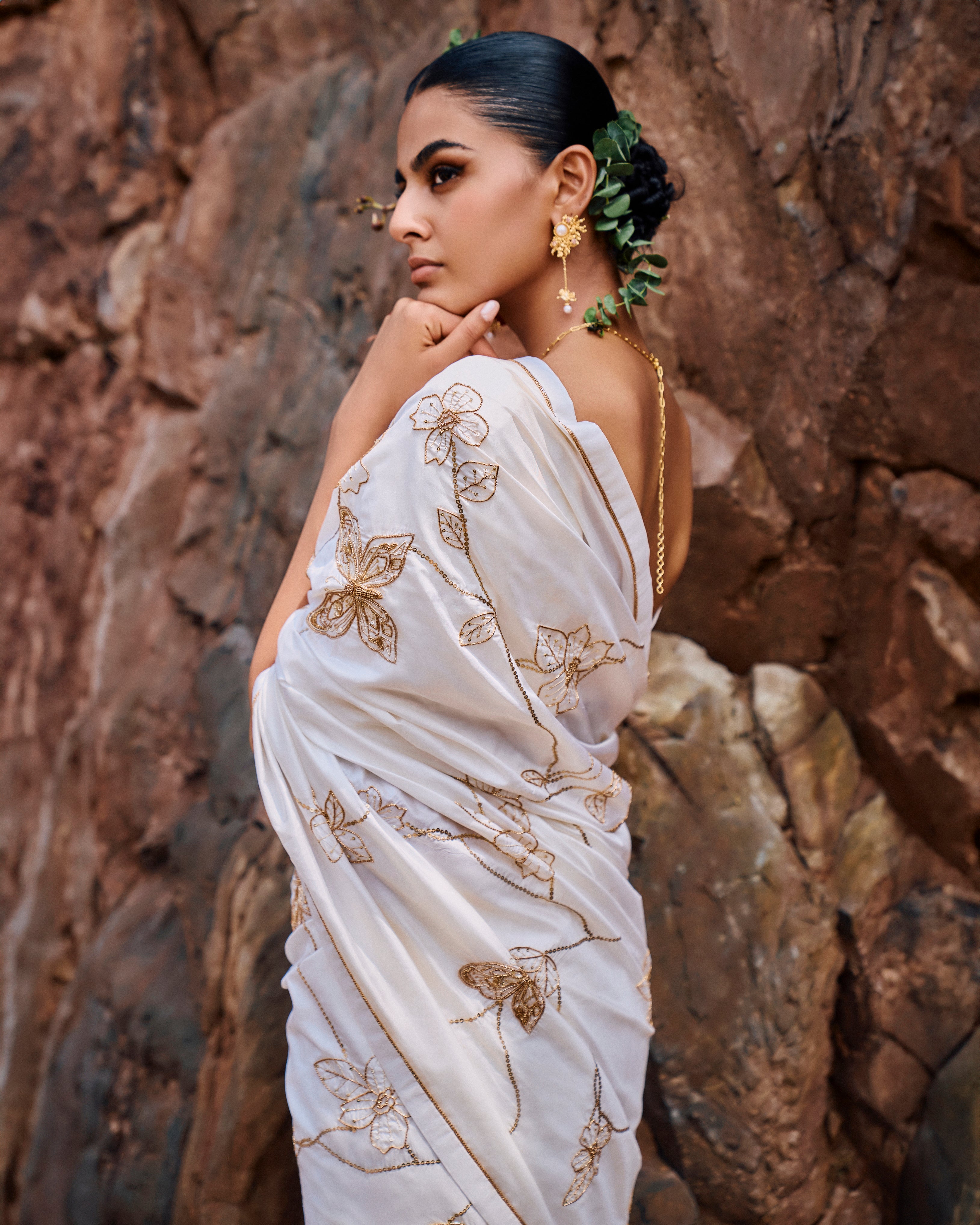 'Sikhiri' White sari features Hand Embroidered border with Golden Butterfly design as Jaal placement all over and is paired with puff sleeves pure silk blouse.