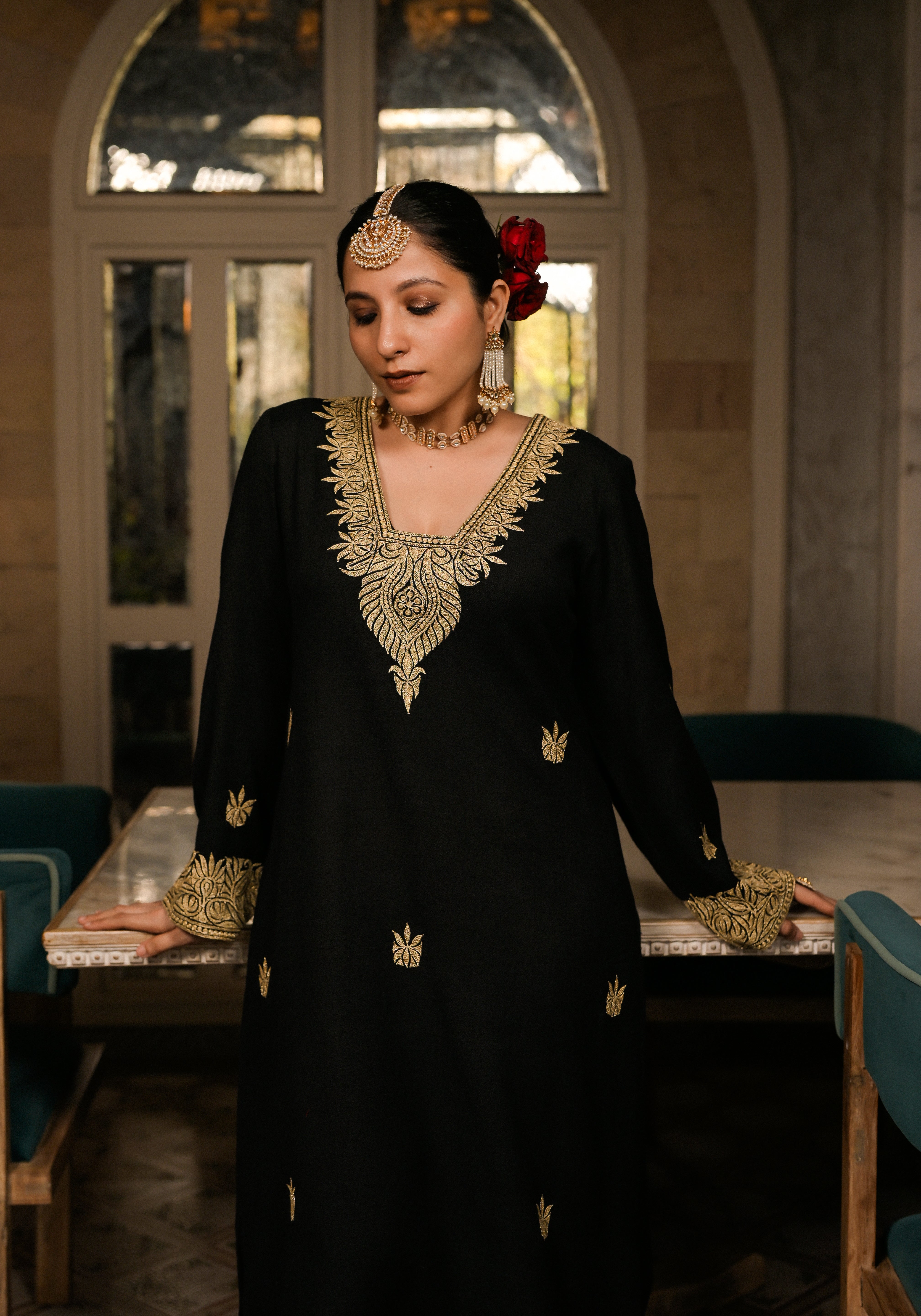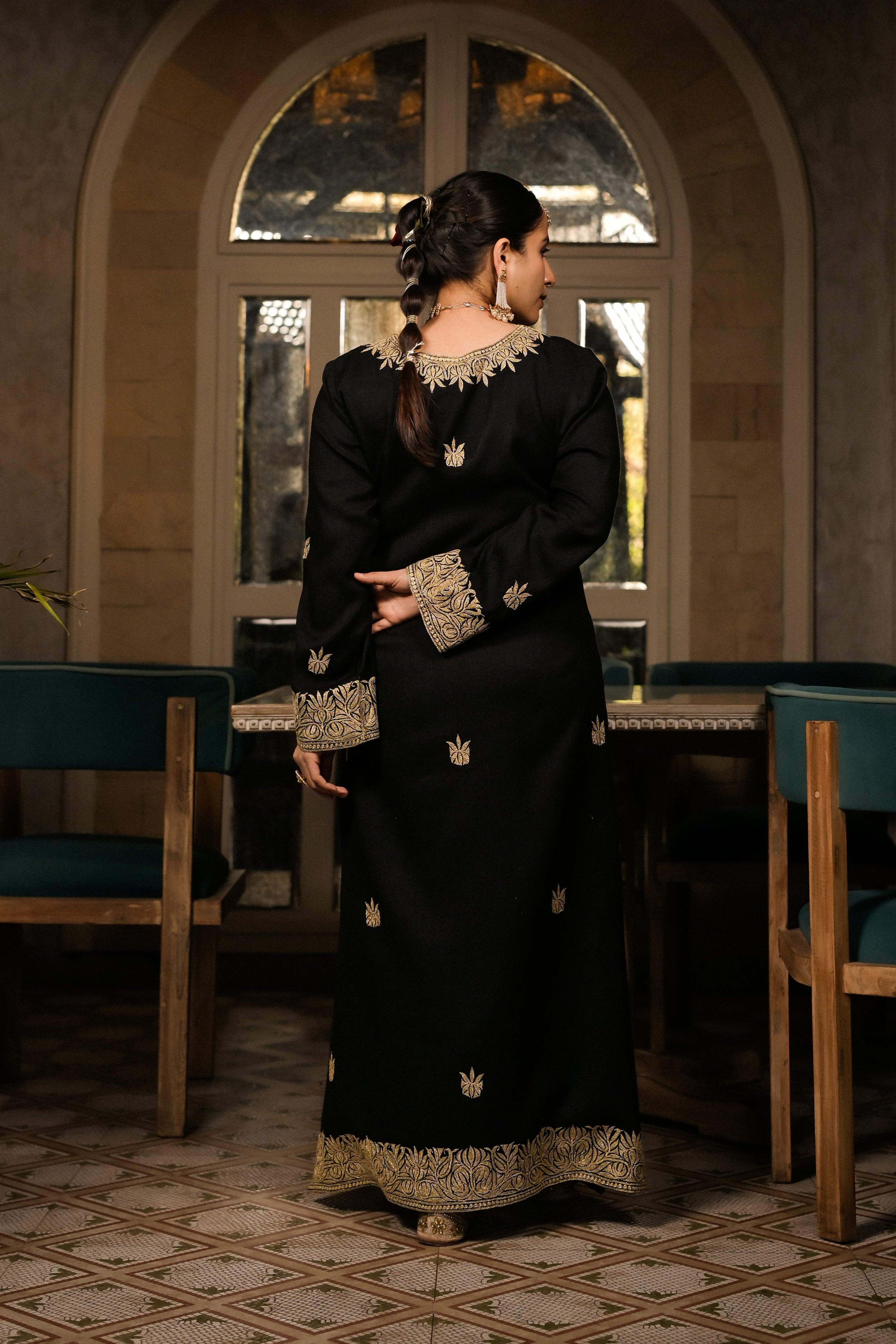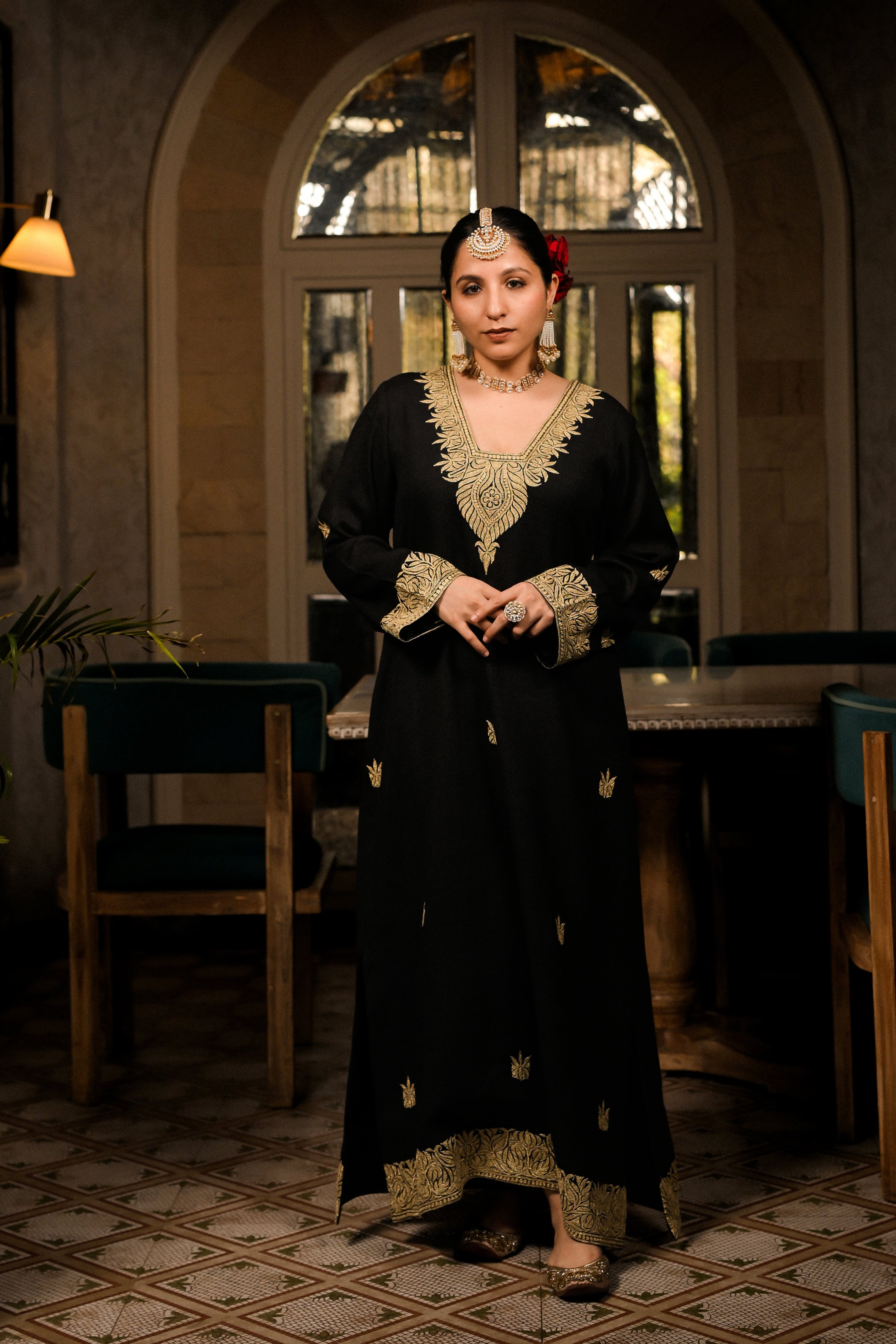 ‘Siyah Dilkash’ Black Kaftan crafted from Pure Matka Silk, complemented by exquisite artistry of Kashmiri tilla embroidery at the neck, border and sleeves.