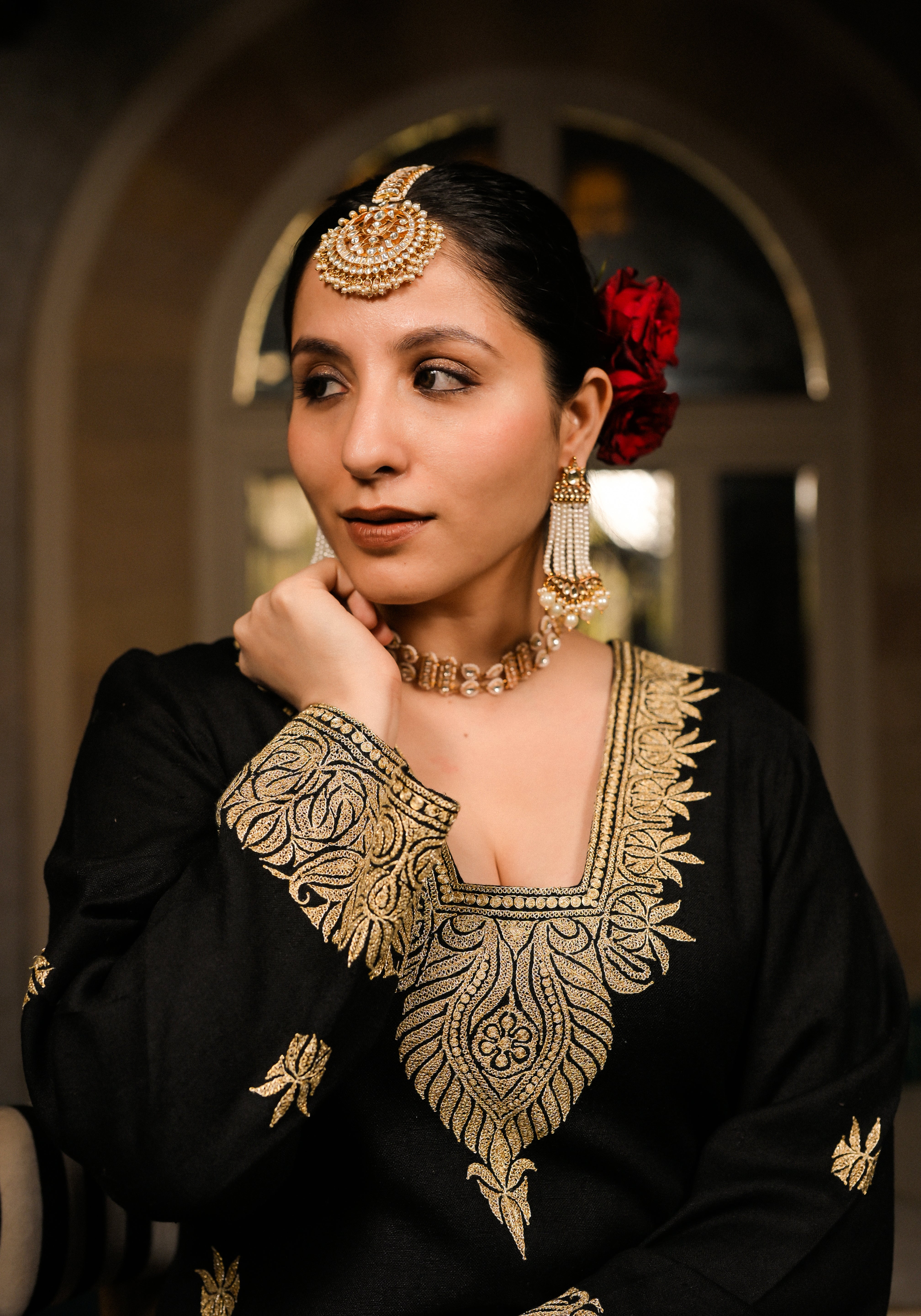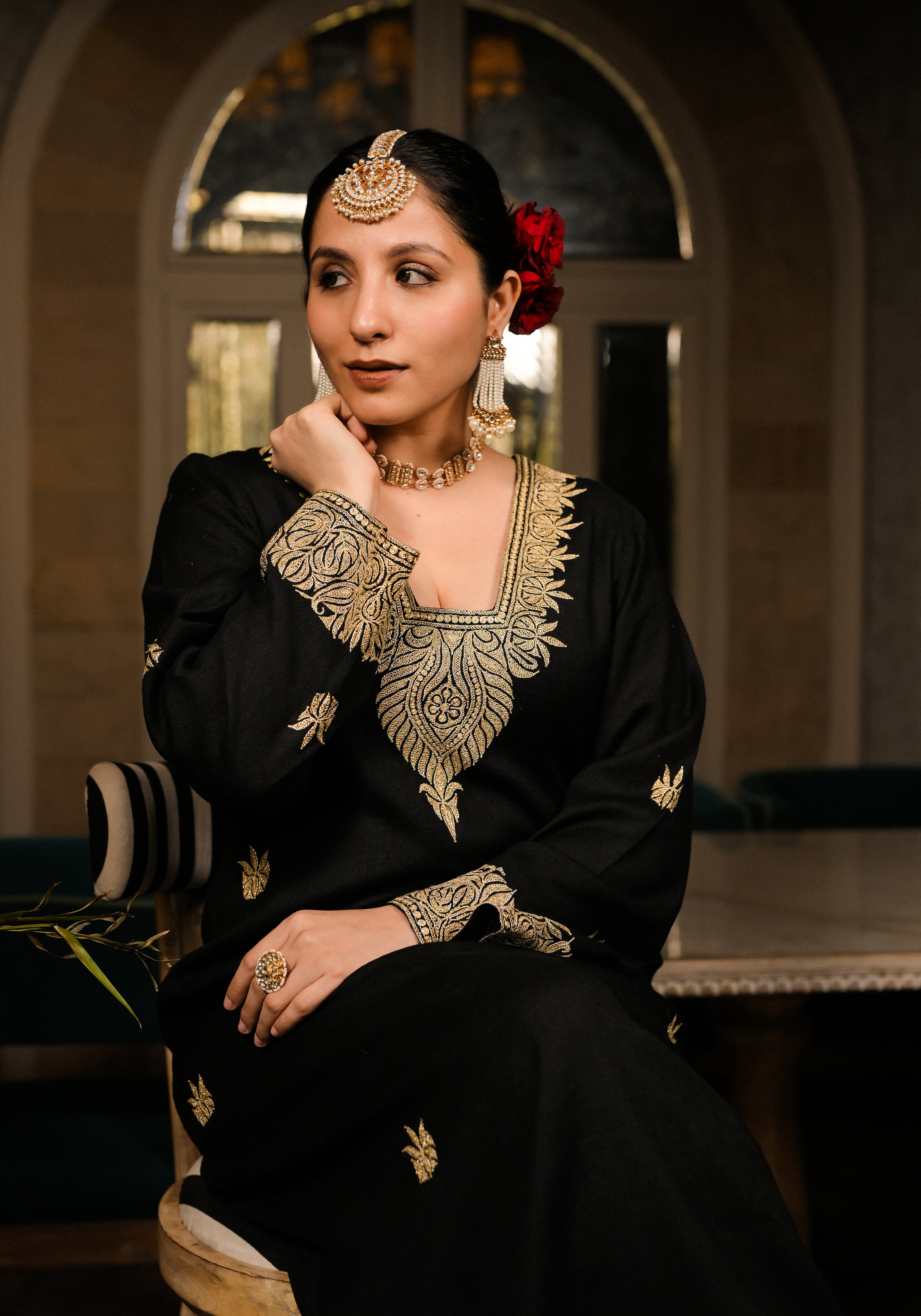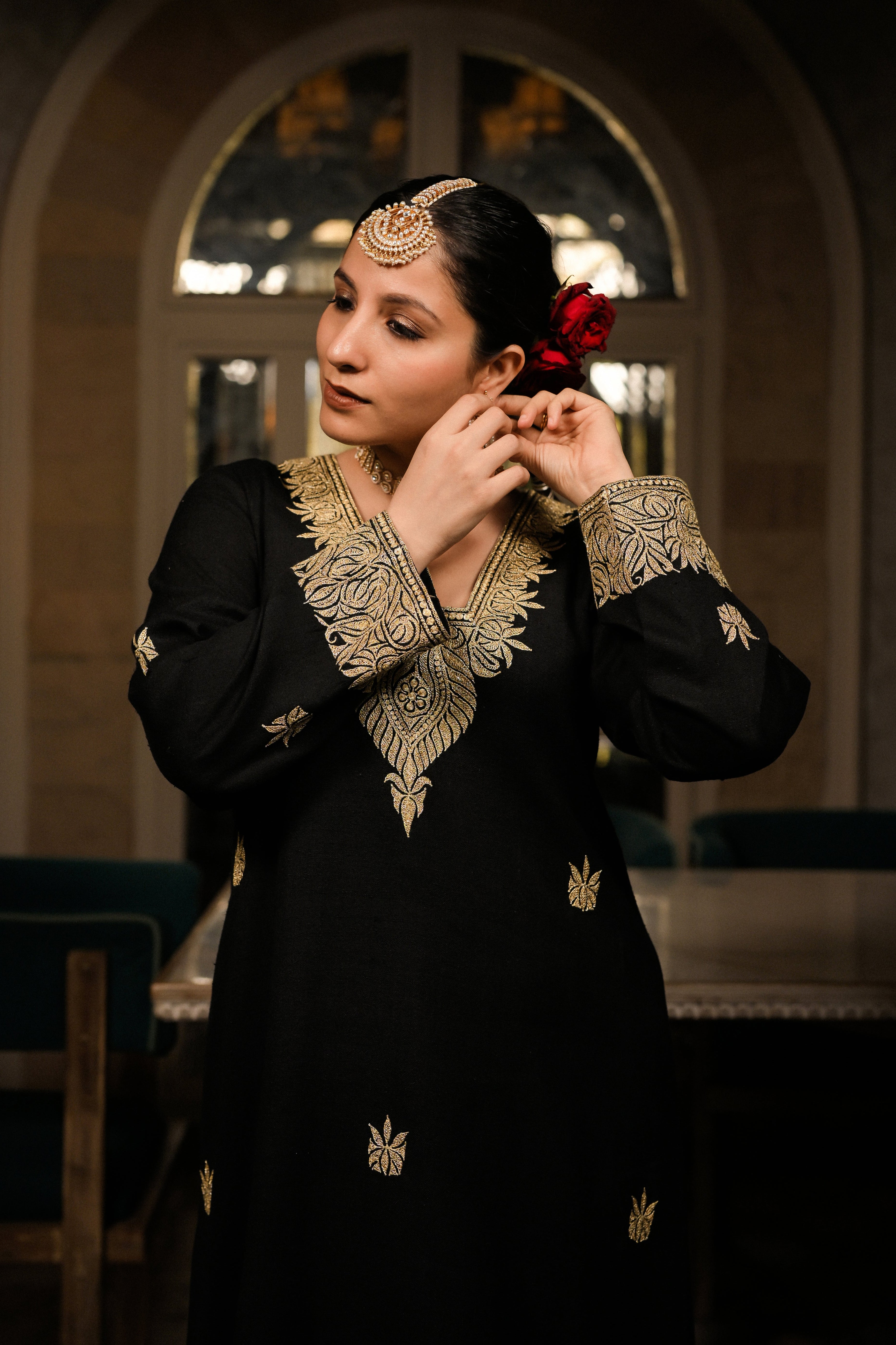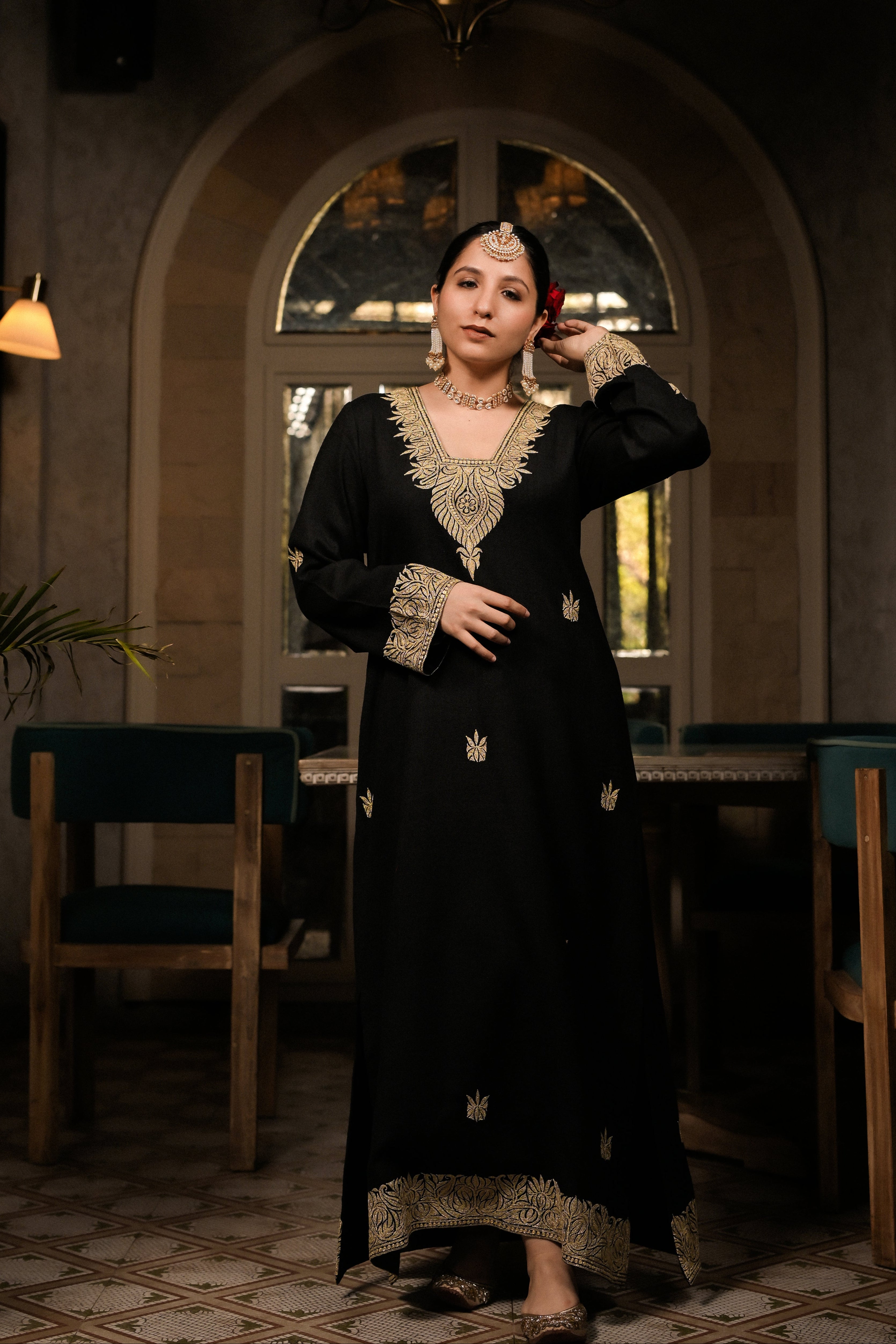 ‘Siyah Dilkash’ Black Kaftan crafted from Pure Matka Silk, complemented by exquisite artistry of Kashmiri tilla embroidery at the neck, border and sleeves.