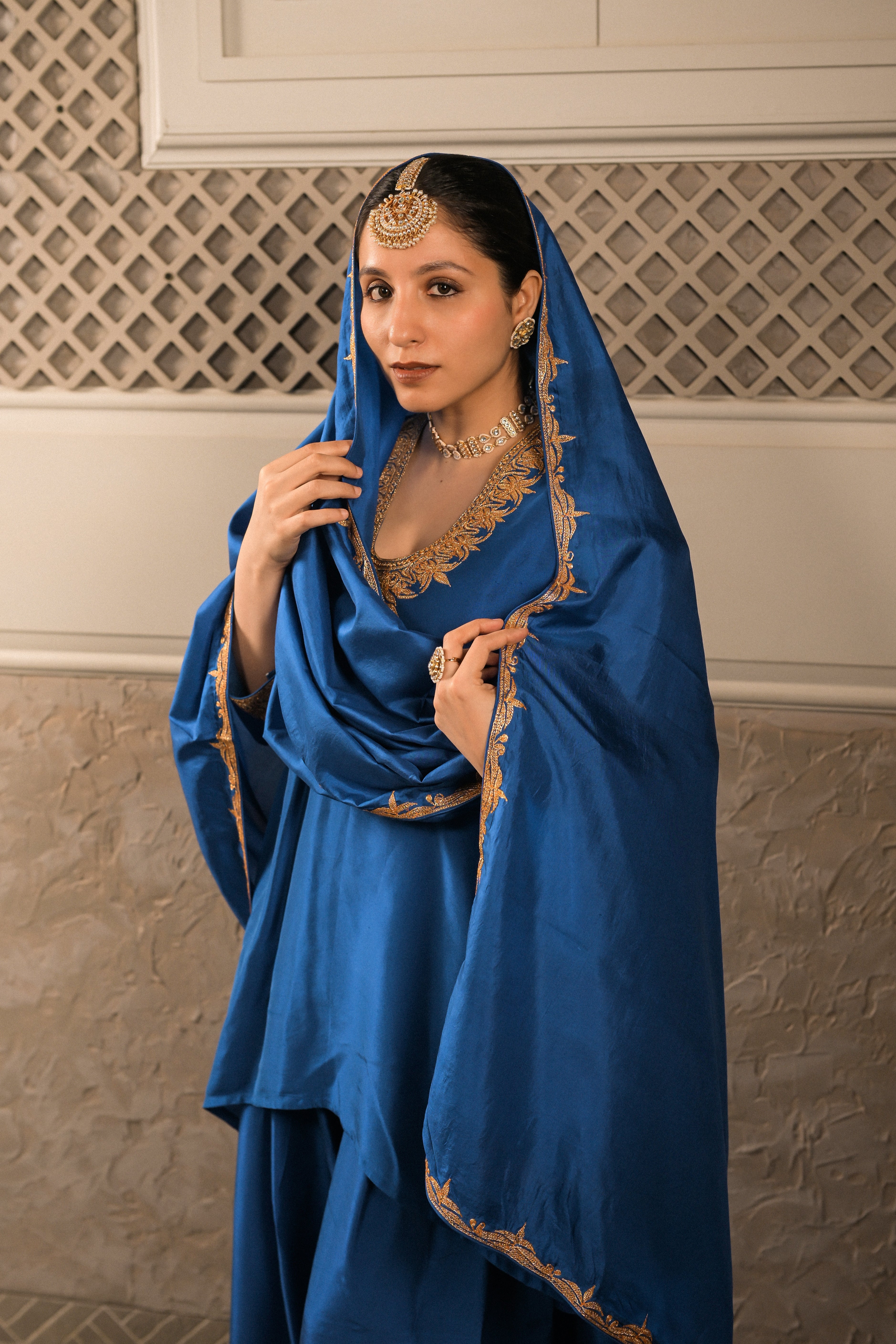 ‘Smera' Royal Blue kurta with high low palazzo pants crafted from Dupion Silk features intricate hand embroidered Kashmiri tilla embroidery. It is paired with matching silk royal blue dupatta.
