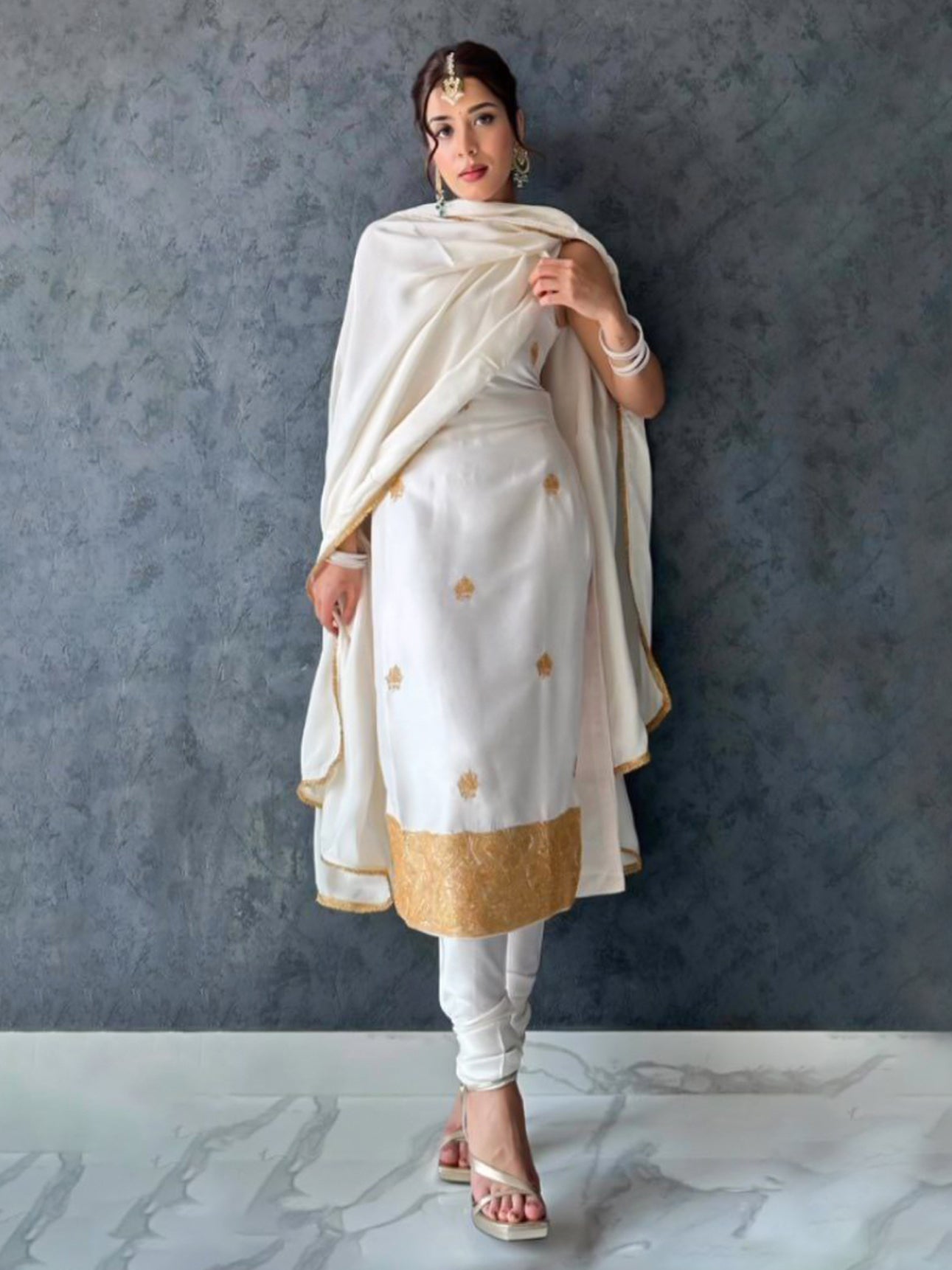 ‘Kirat’ Ivory Kurta set crafted from Dupion Silk features intricate hand embroidered Kashmiri tilla kaam. It is paired with matching silk ivory dupatta.