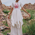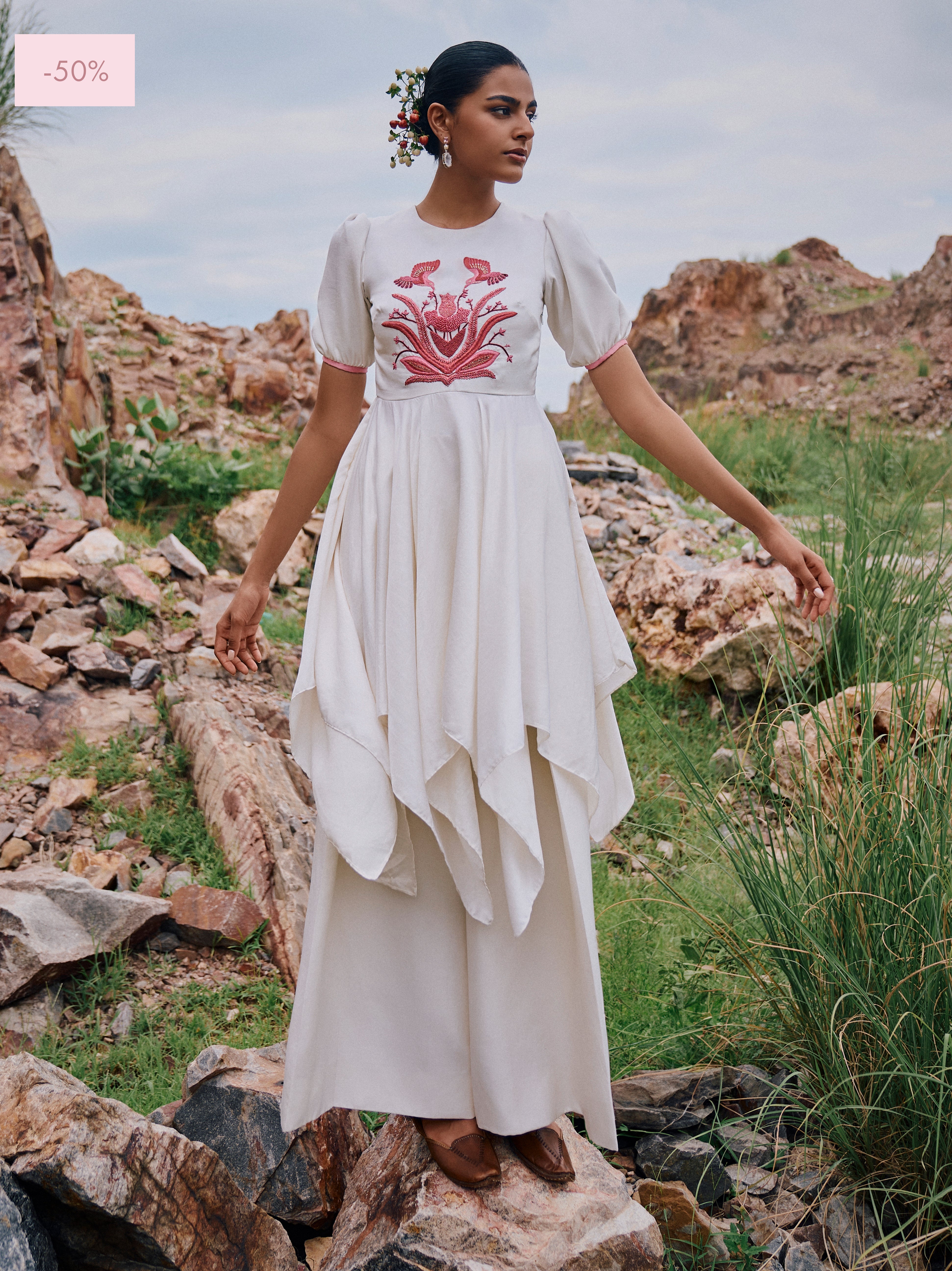 Puff sleeves High Low Satin Chiniya 'Sumukhi' kurta features hand embroidered Pink Bird Garden motif and is paired with matching 'Gadh' pants.