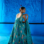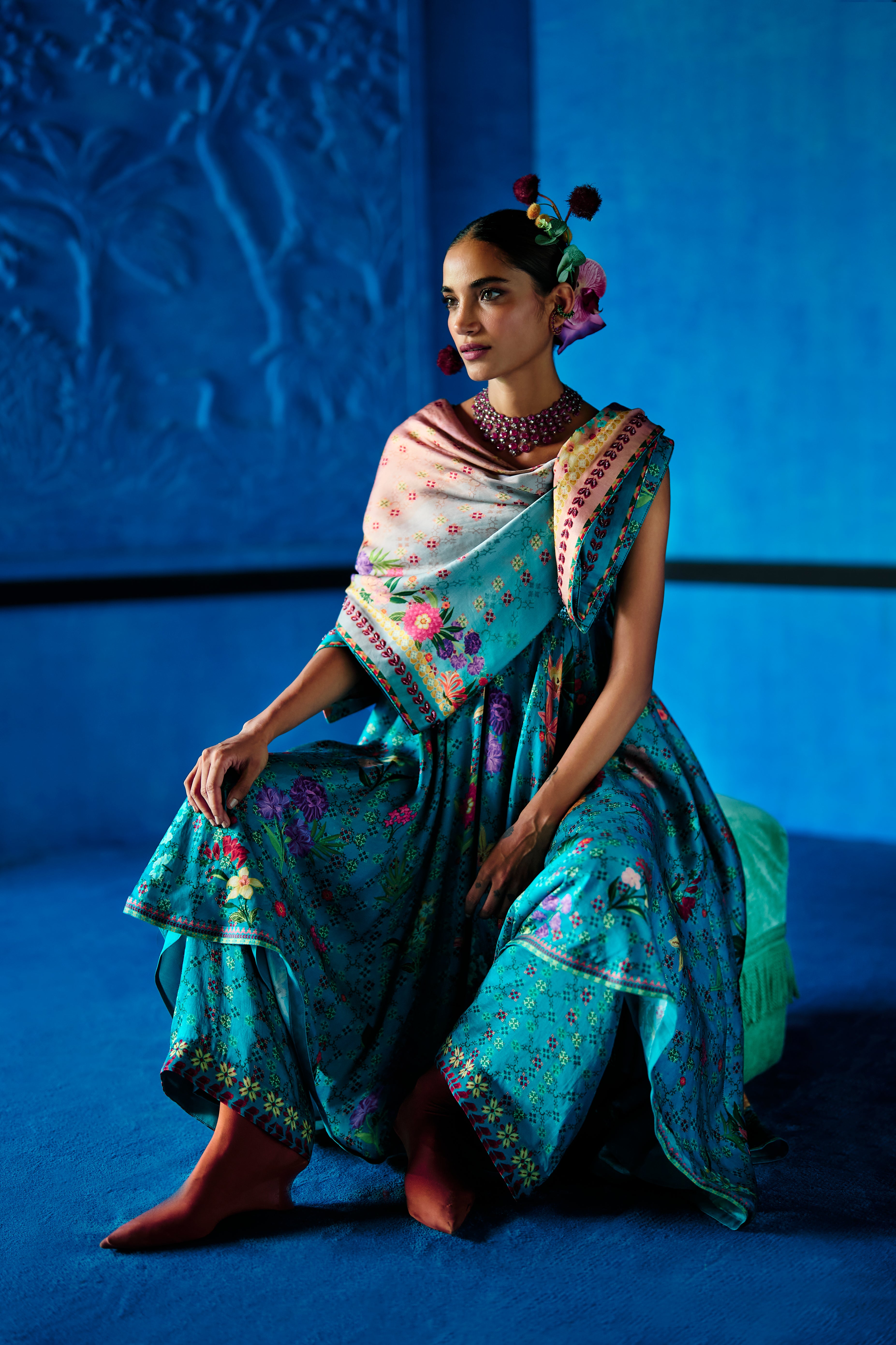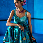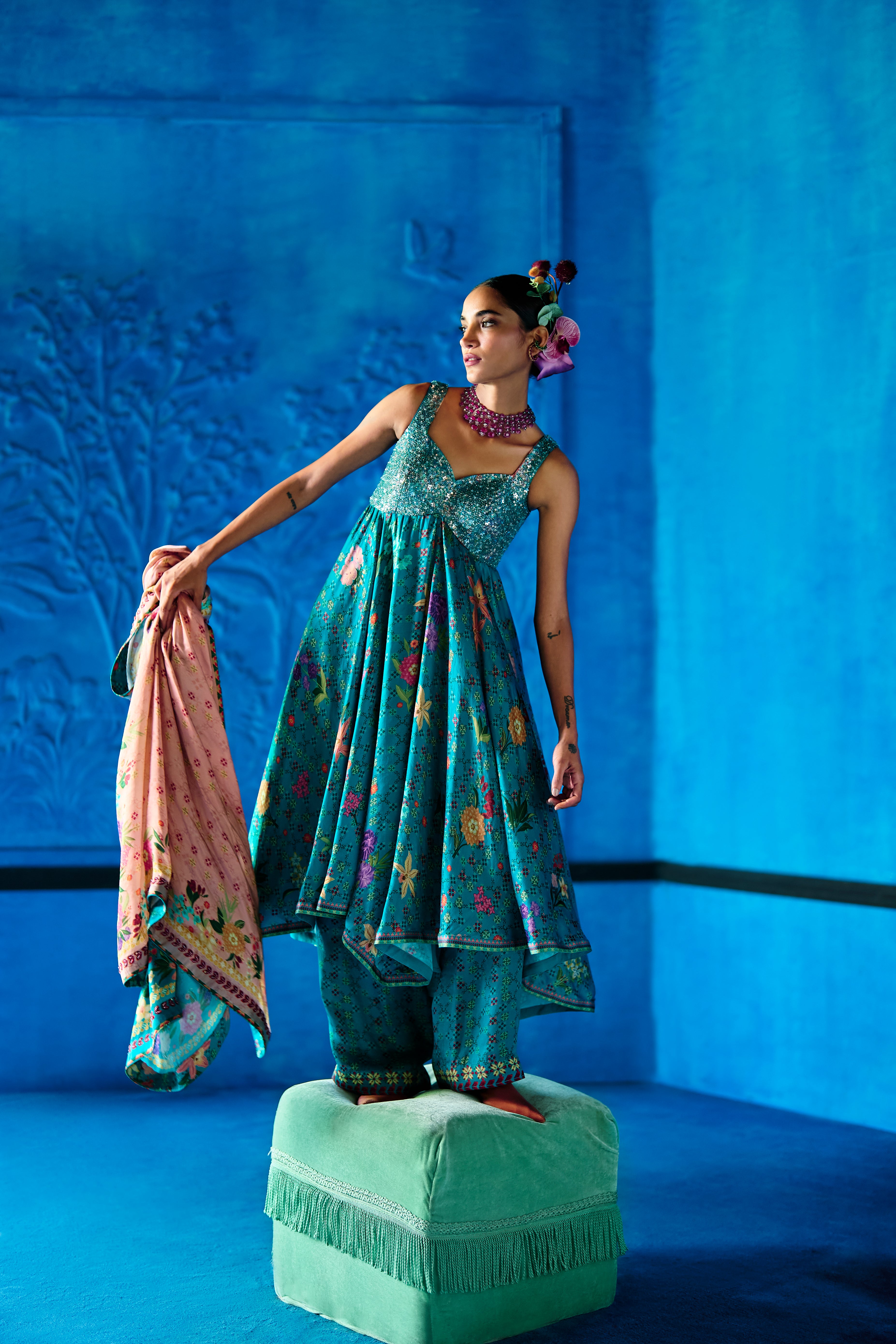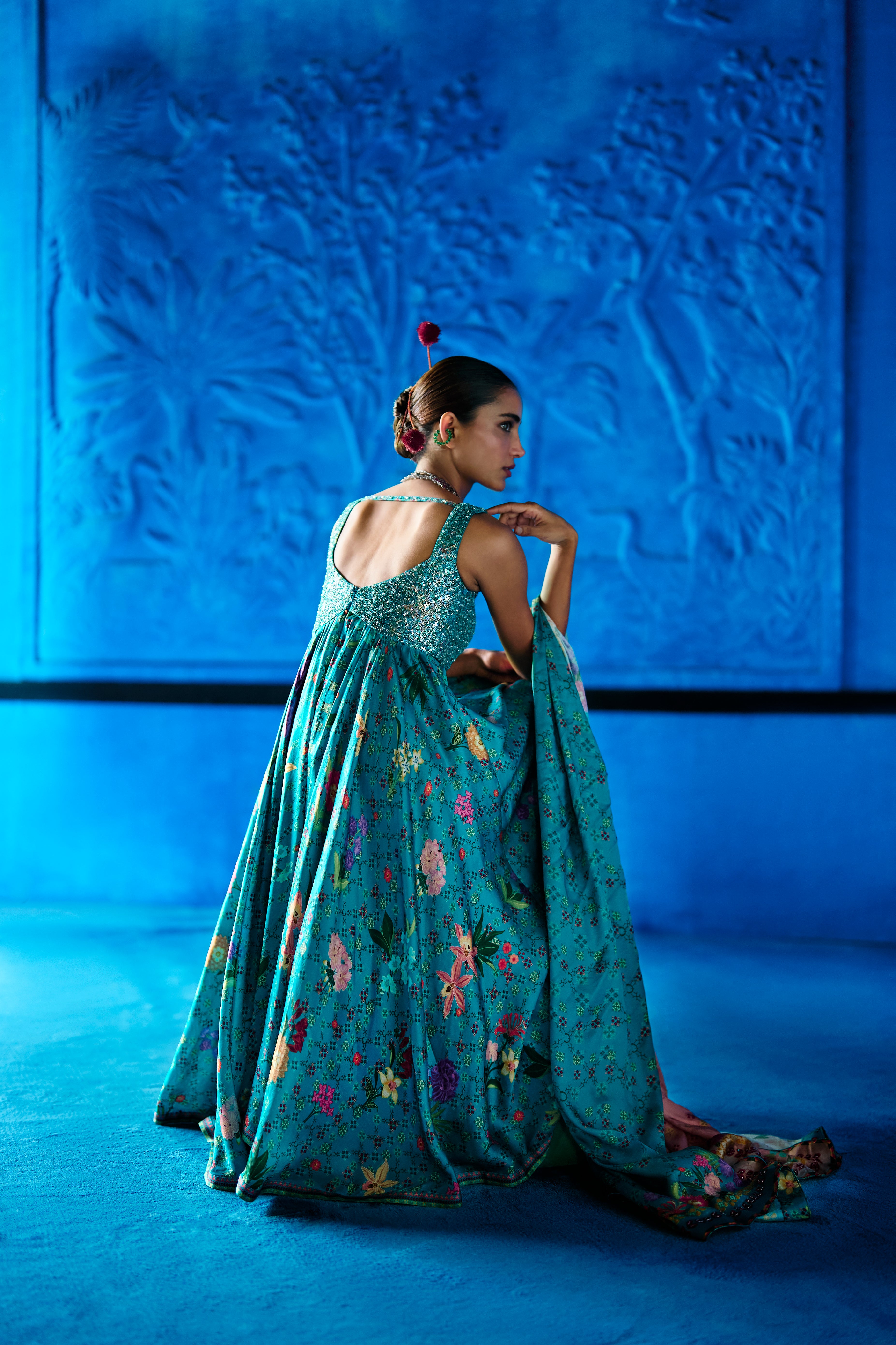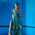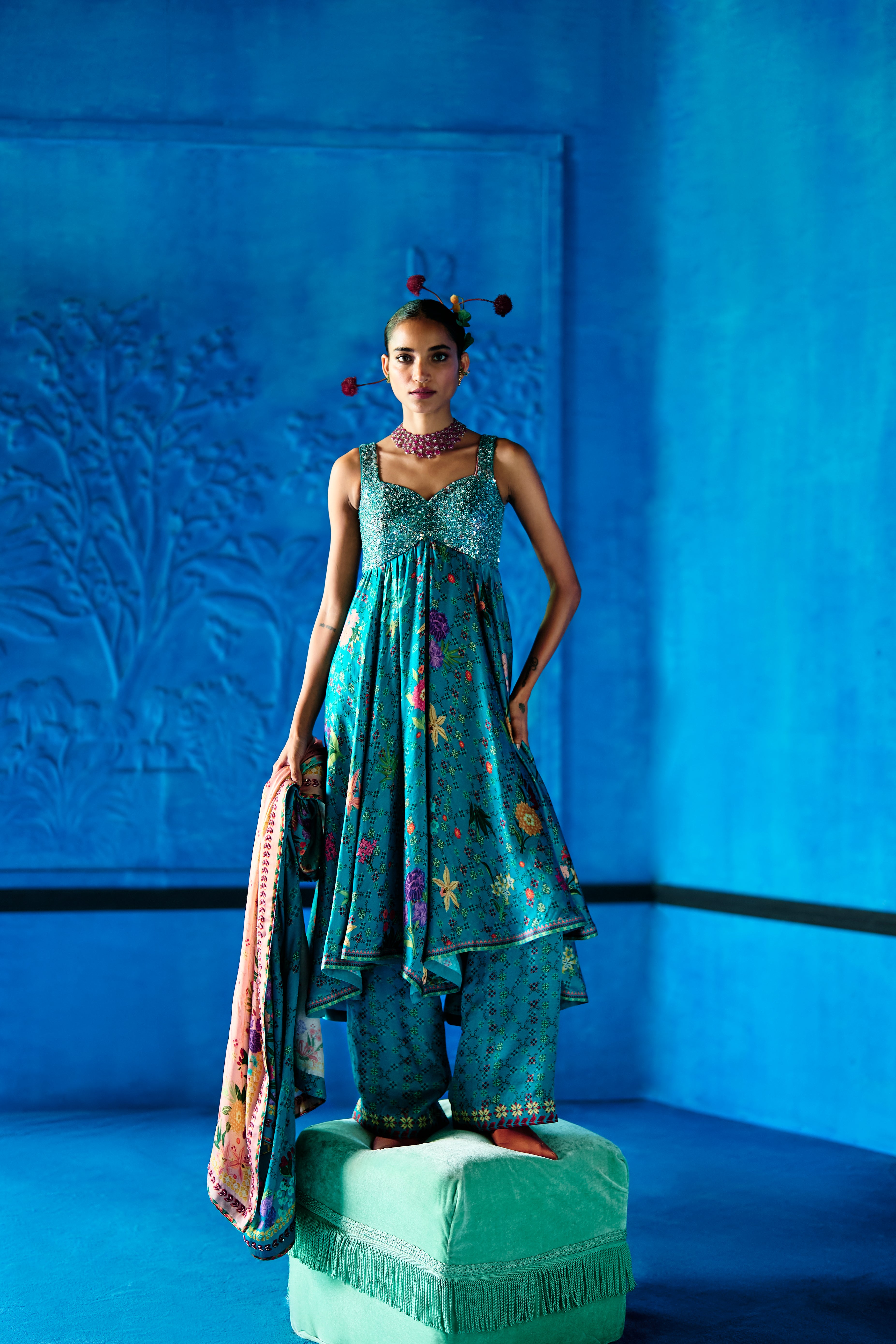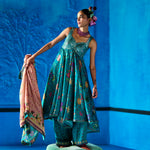 Teal blue floral printed Bemberg satin kurta with heavily embellished bustier style bodice and sweet heart neckline. Kurta Flows over floral printed wide leg pants and a coordinating floral printed ombre dupatta.