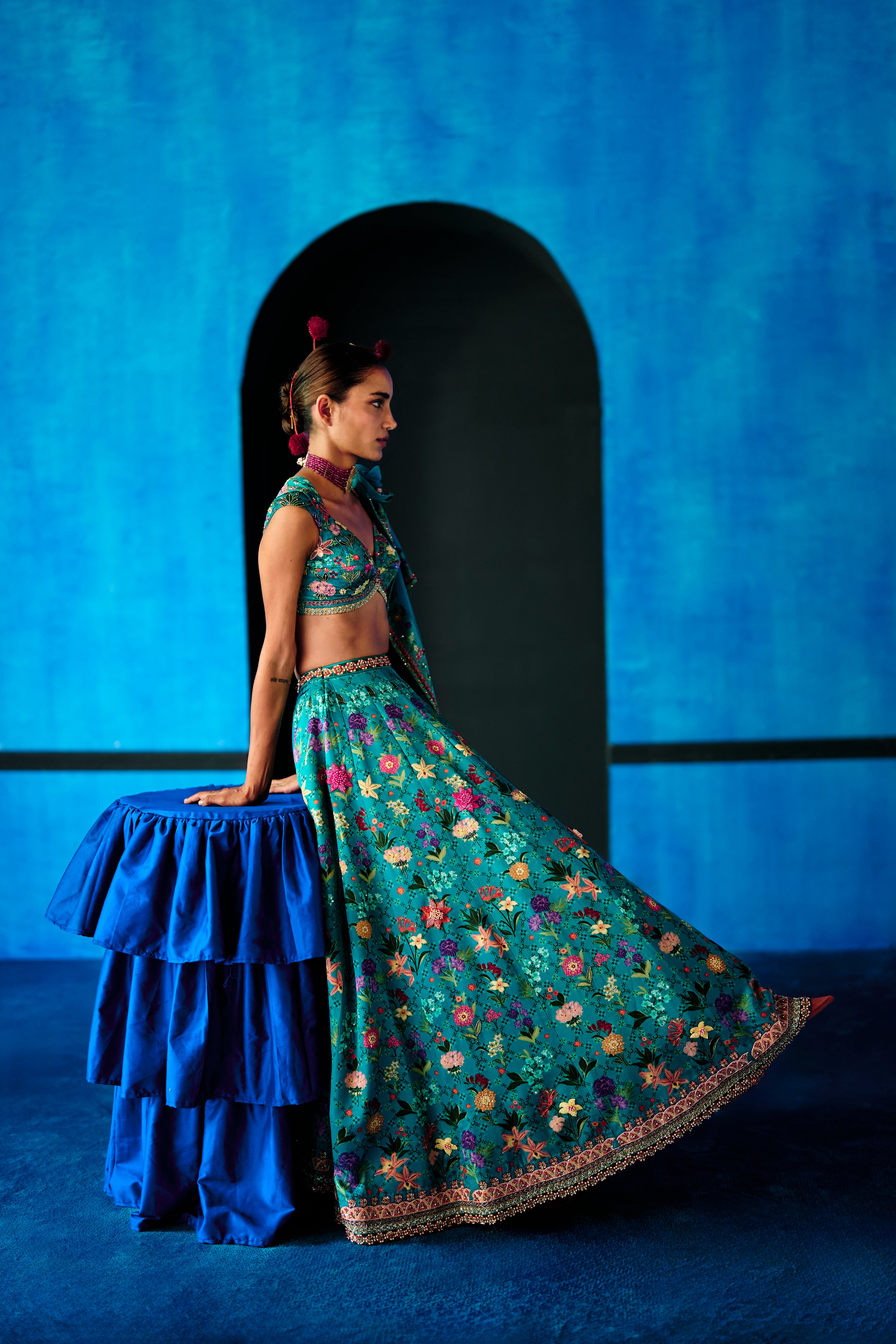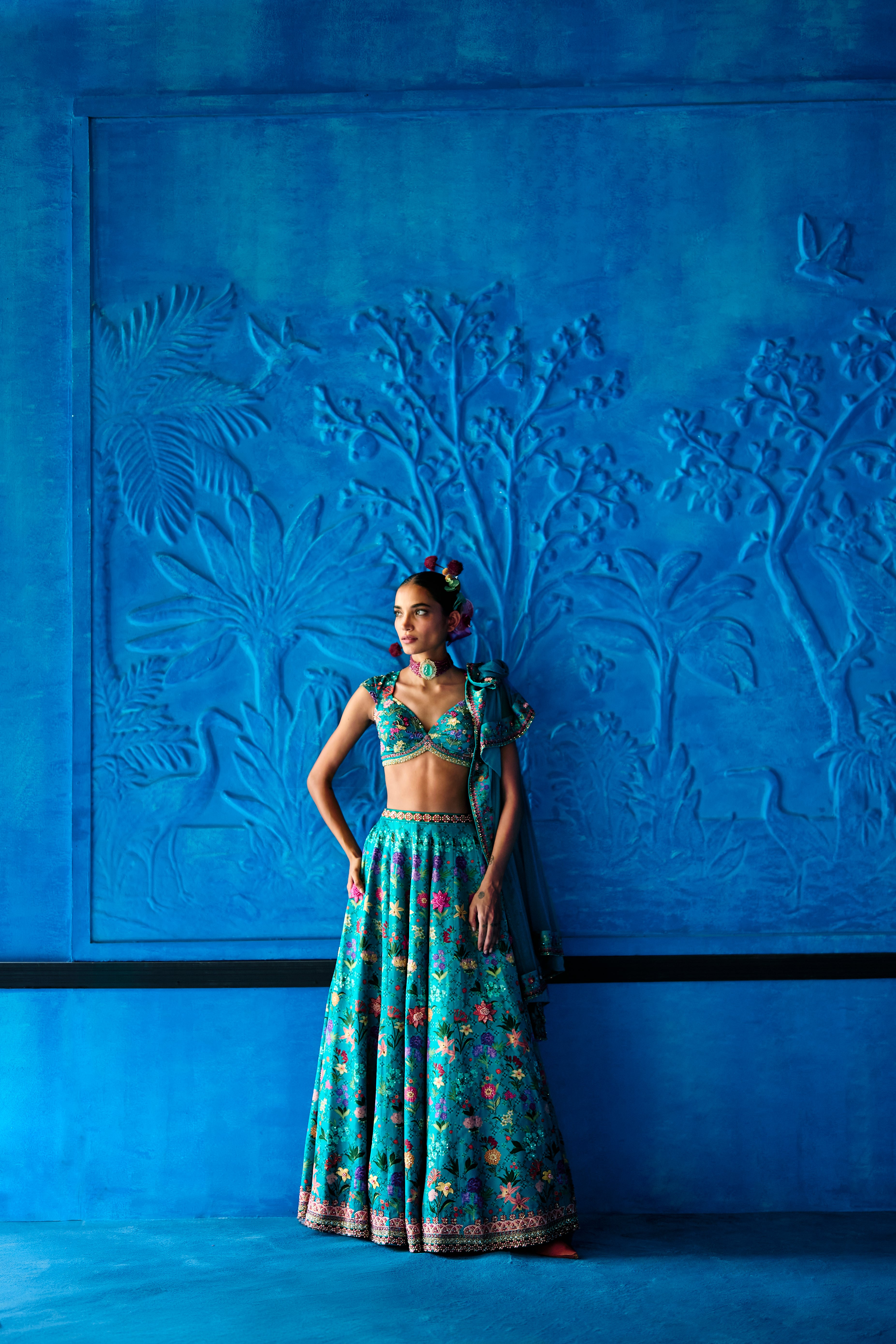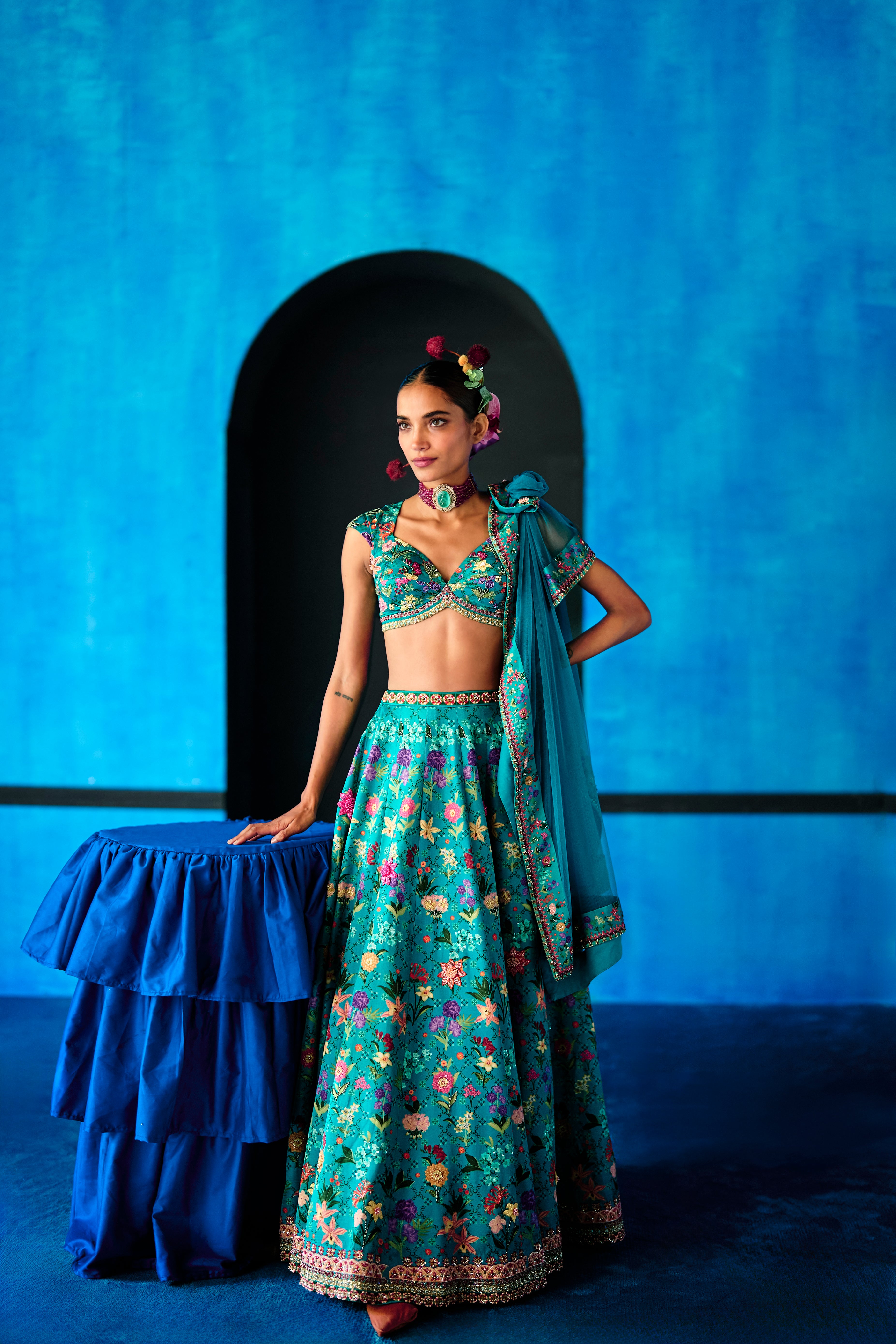 Teal blue floral printed satin dupion lehenga hand embroidered with cutdana, beads and sequins. Paired with a matching cross-bust blouse featuring sleeveless and net dupatta edged with embroidered detailing.