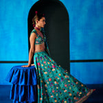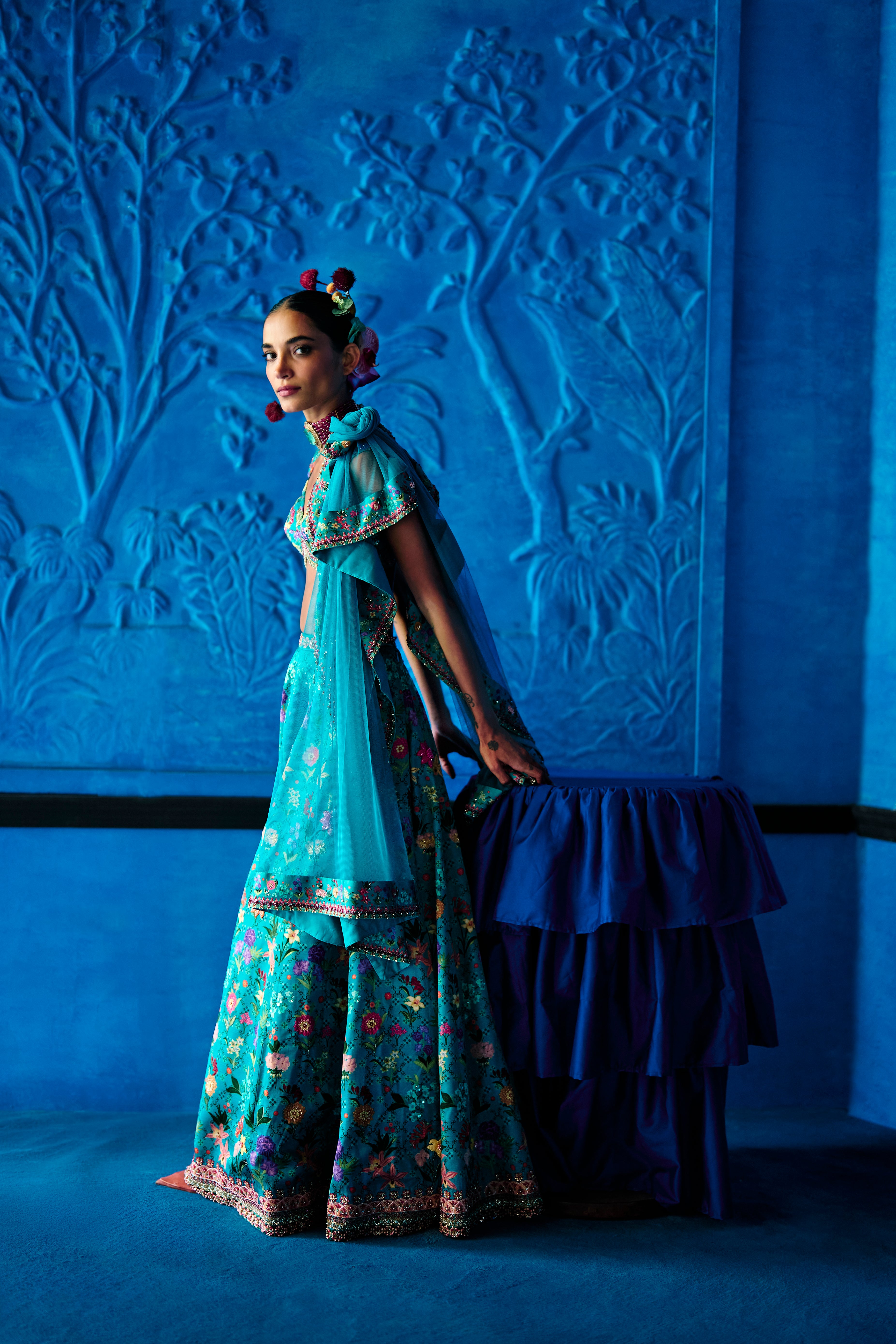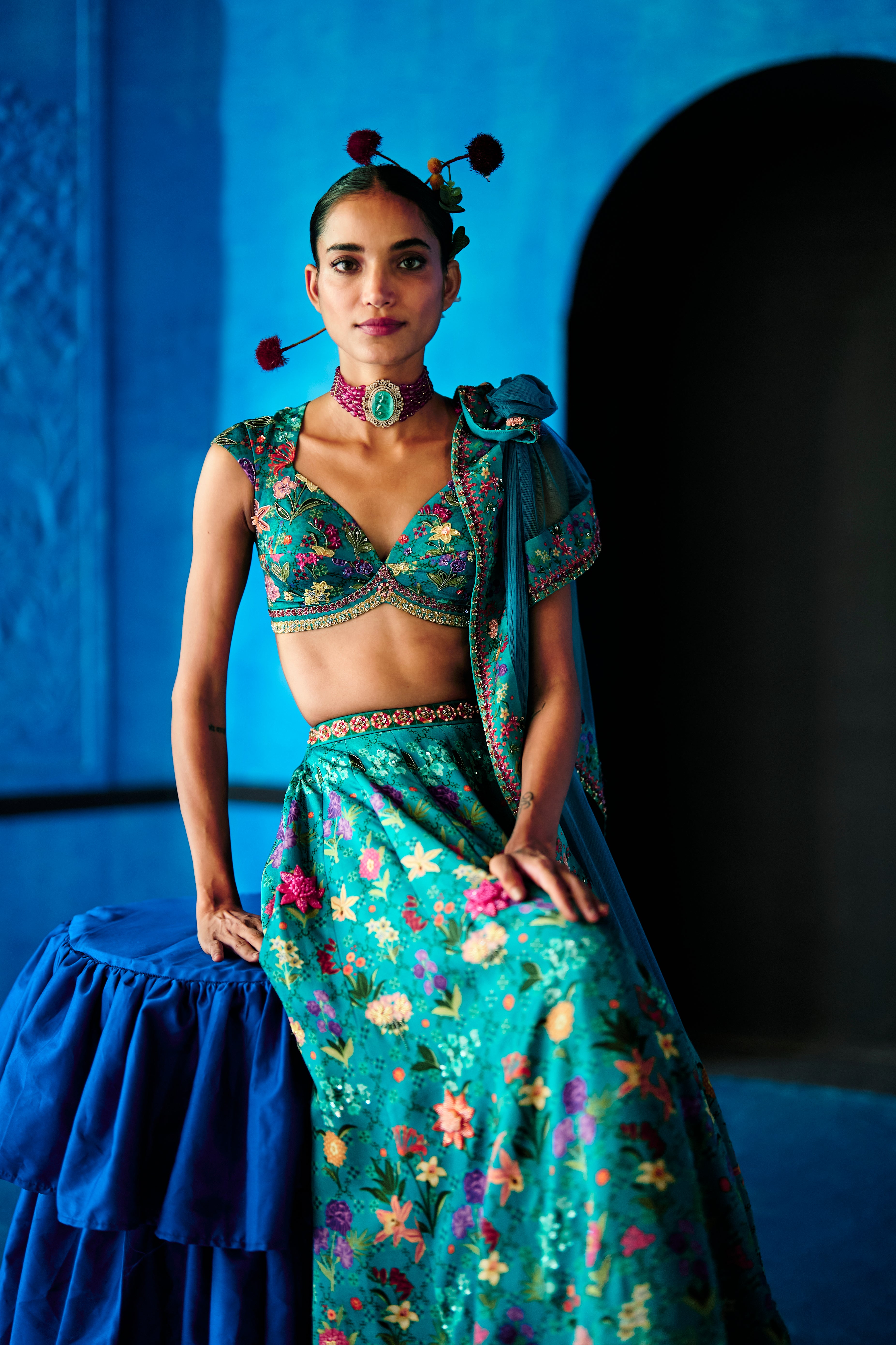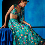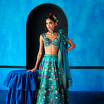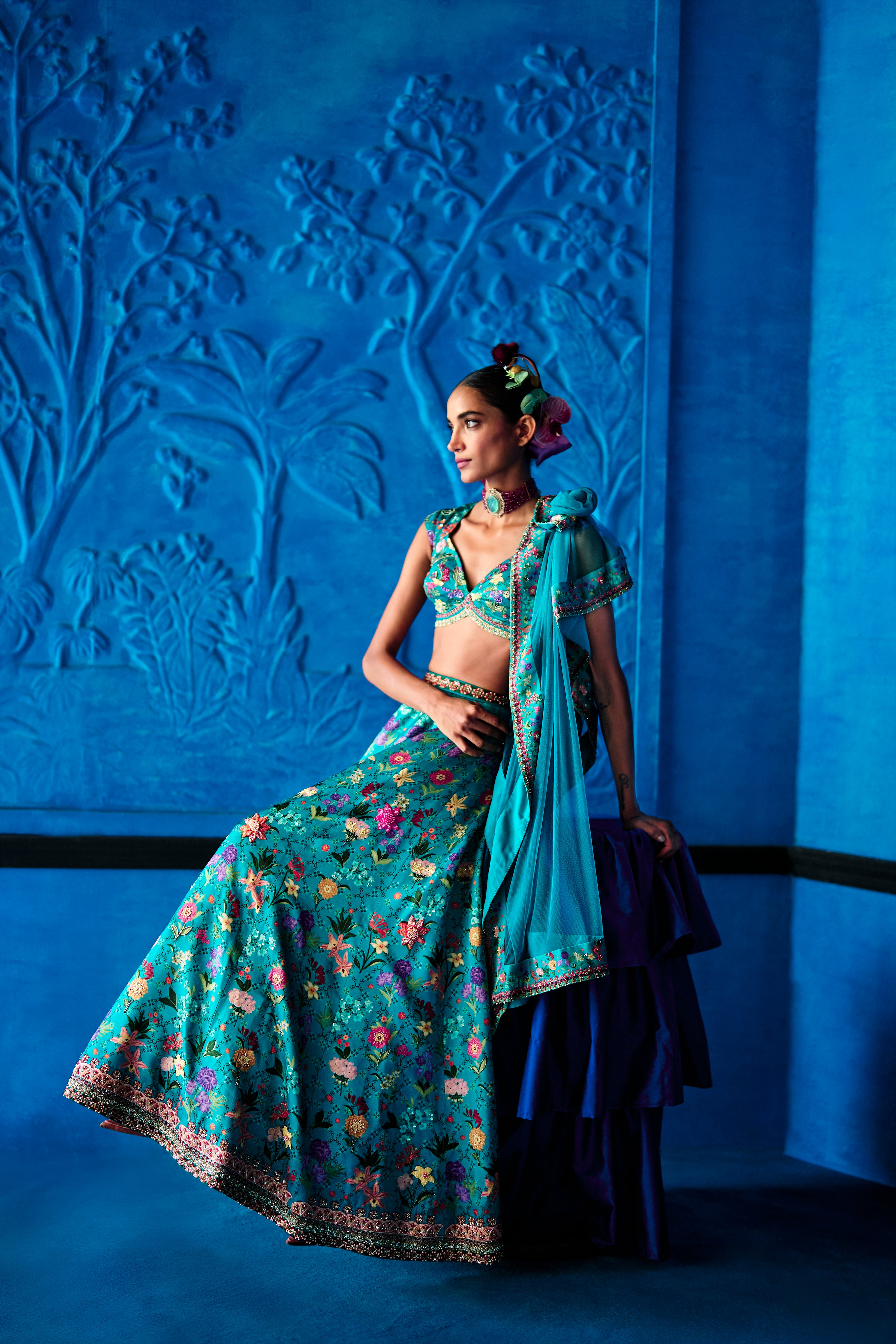 Teal blue floral printed satin dupion lehenga hand embroidered with cutdana, beads and sequins. Paired with a matching cross-bust blouse featuring sleeveless and net dupatta edged with embroidered detailing.