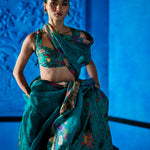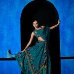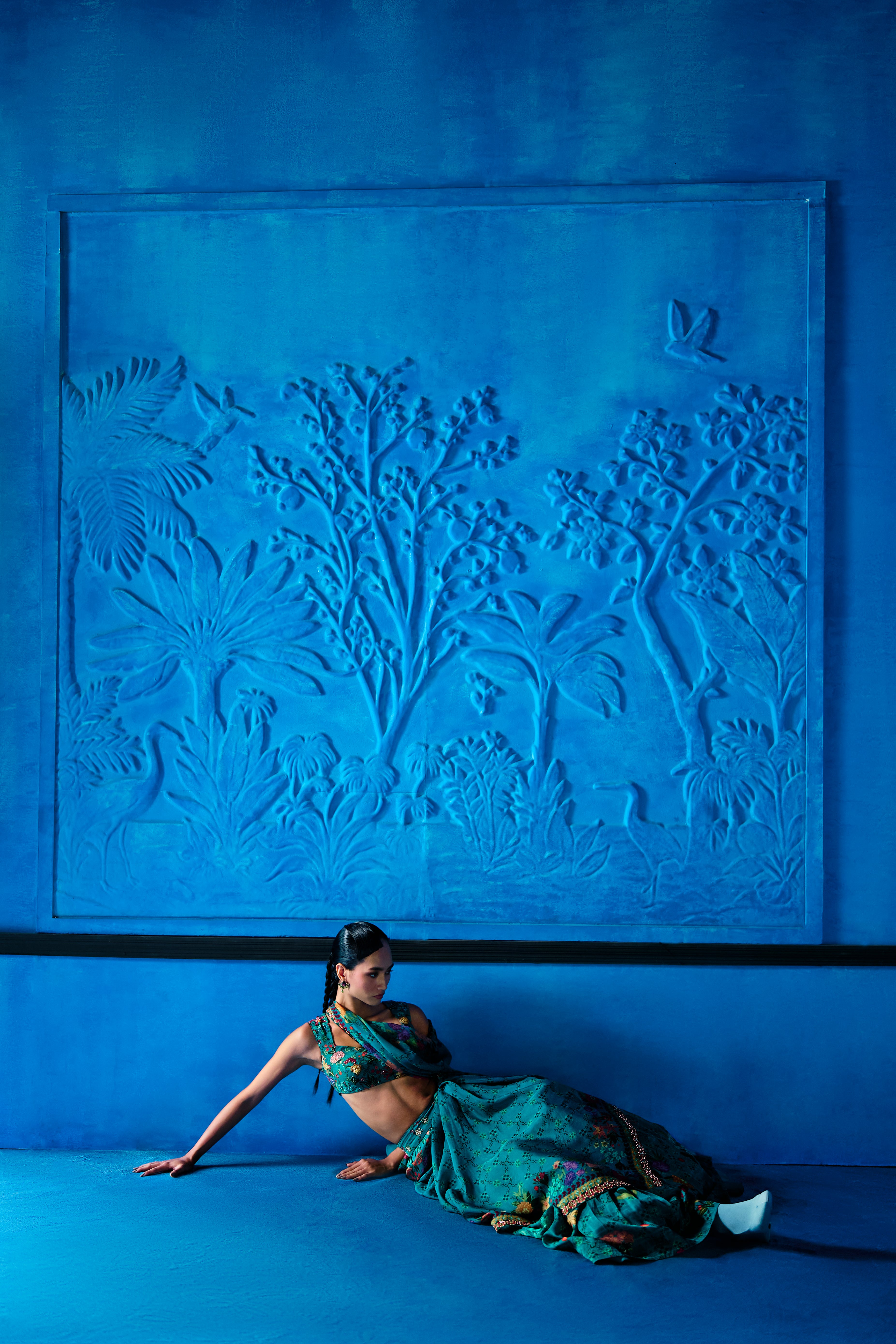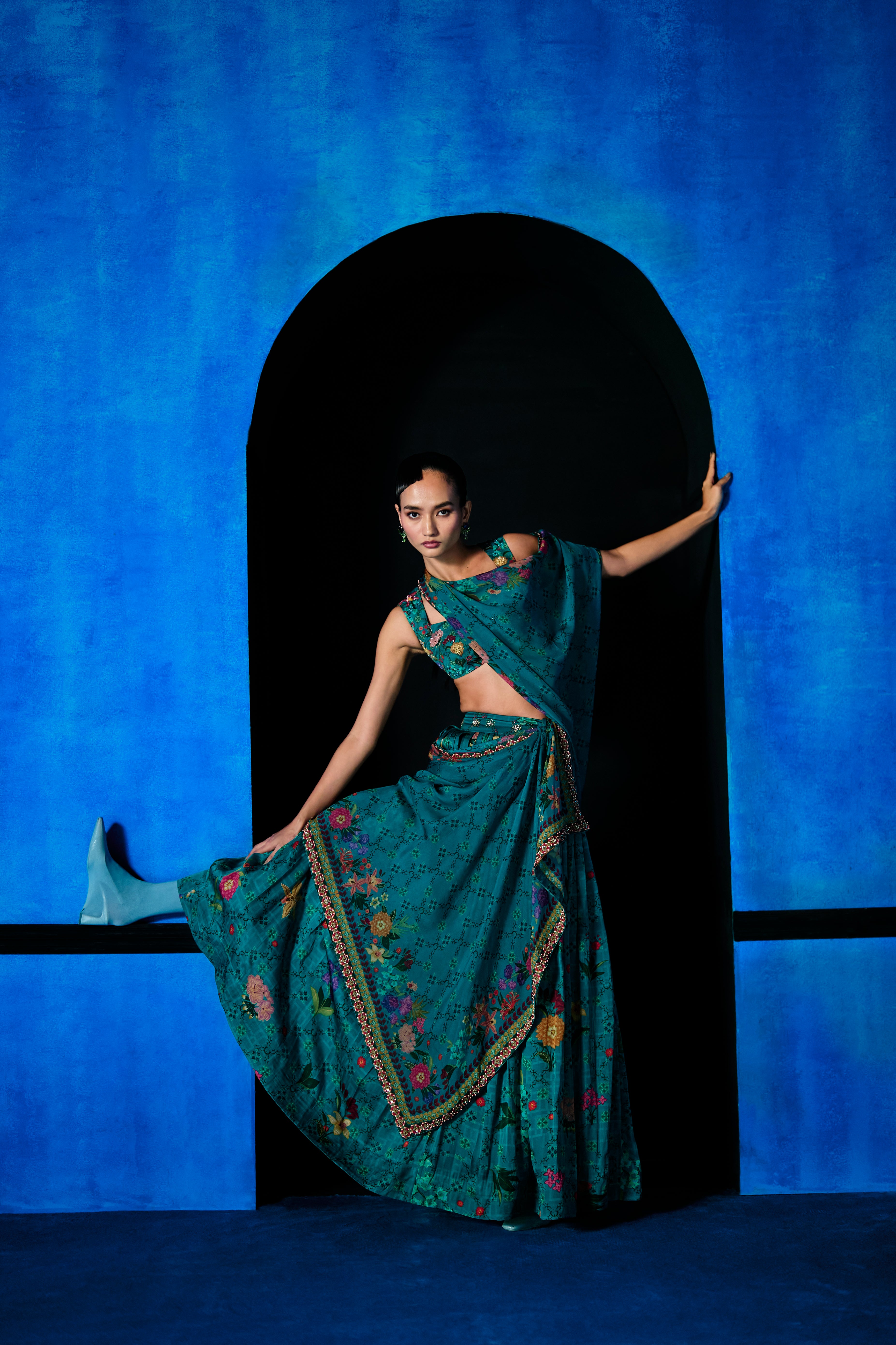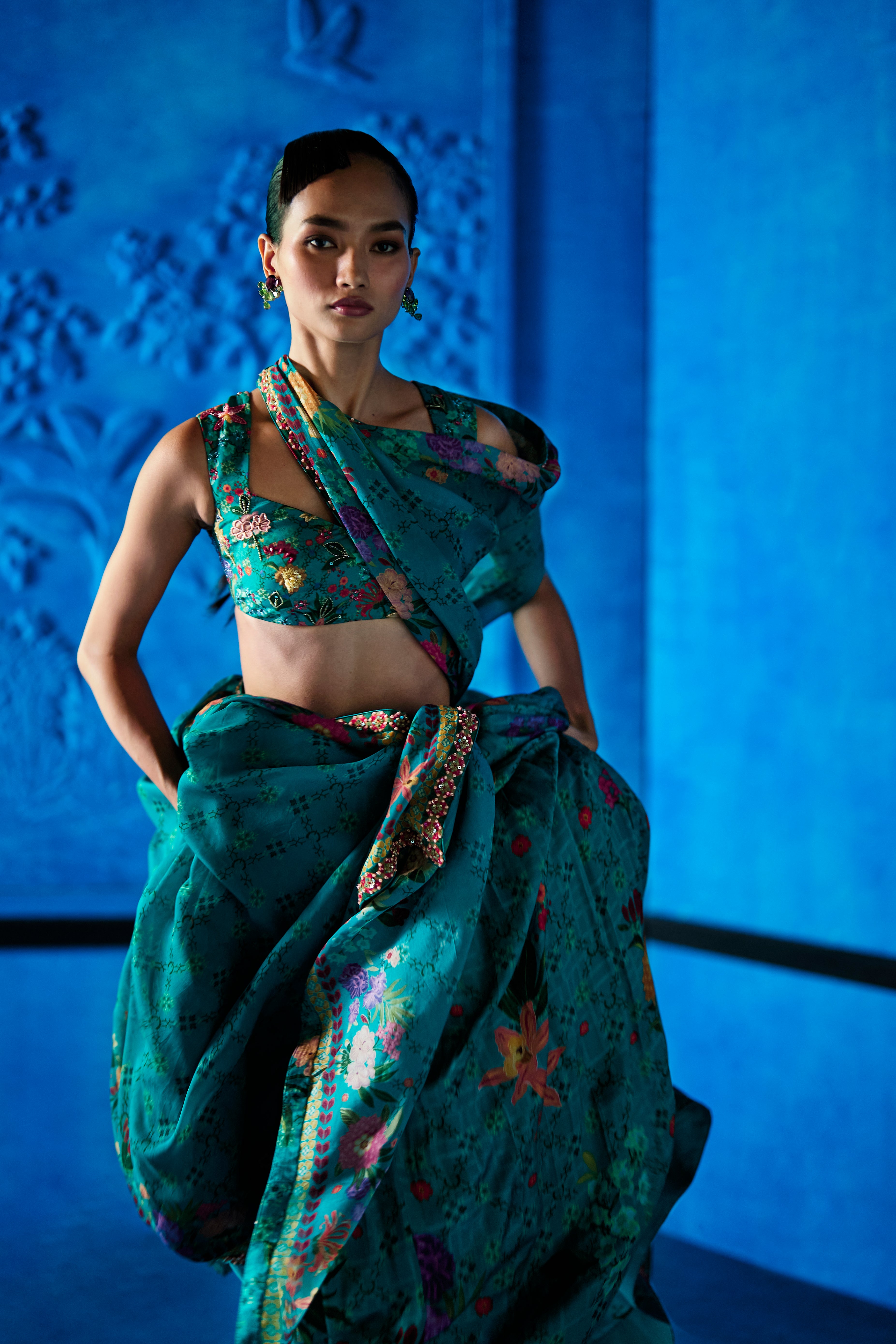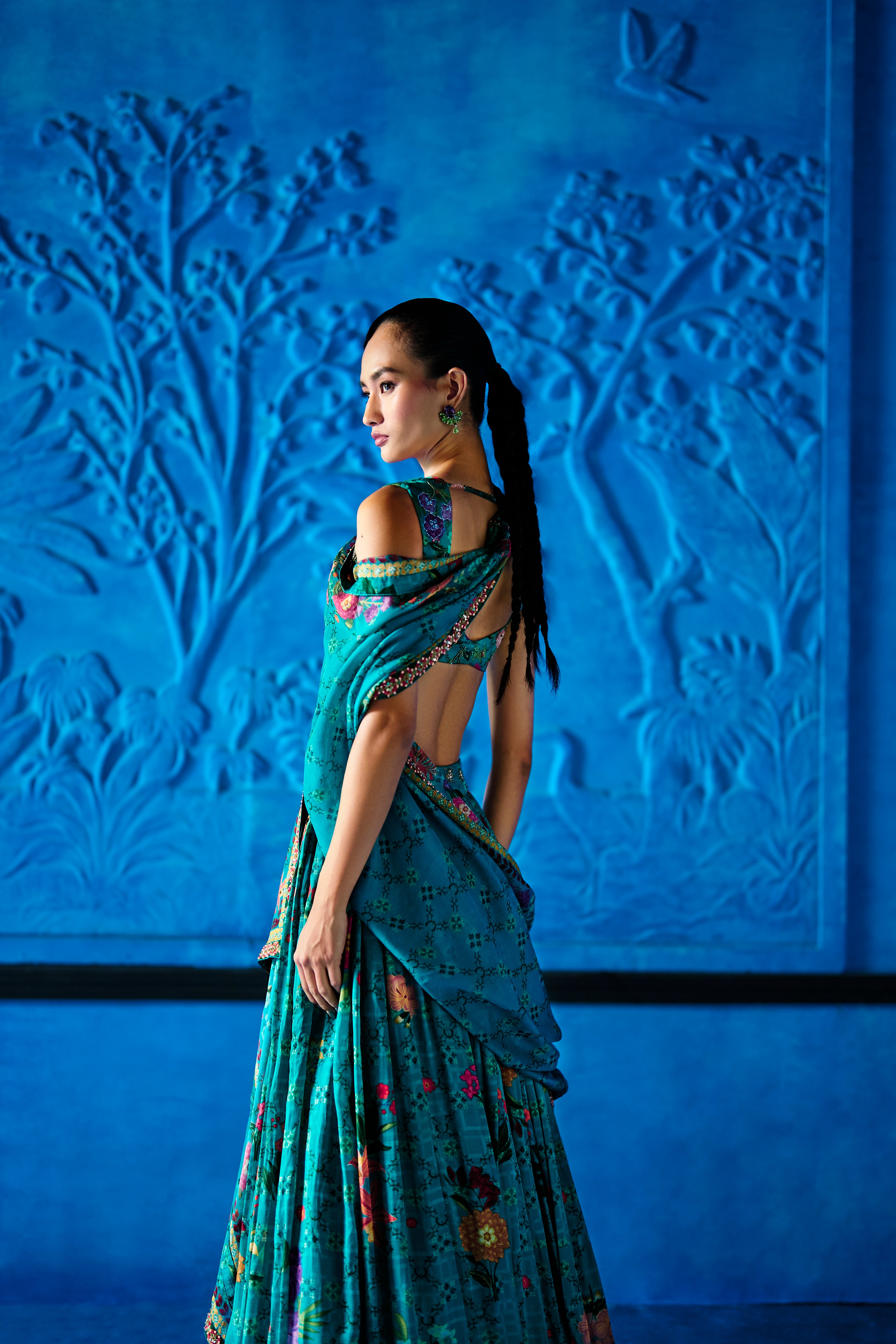 Teal blue floral printed knife pleated satin organza lehenga. Paired with matching embroidered sleeveless blouse and floral printed organza dupatta edged with embroidery.