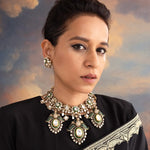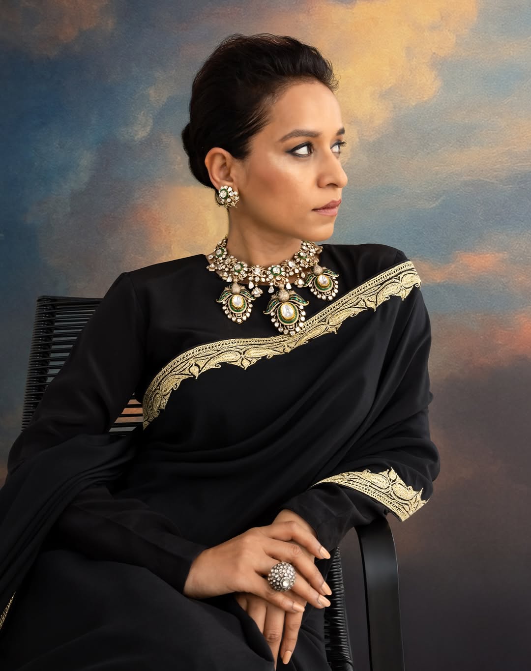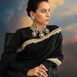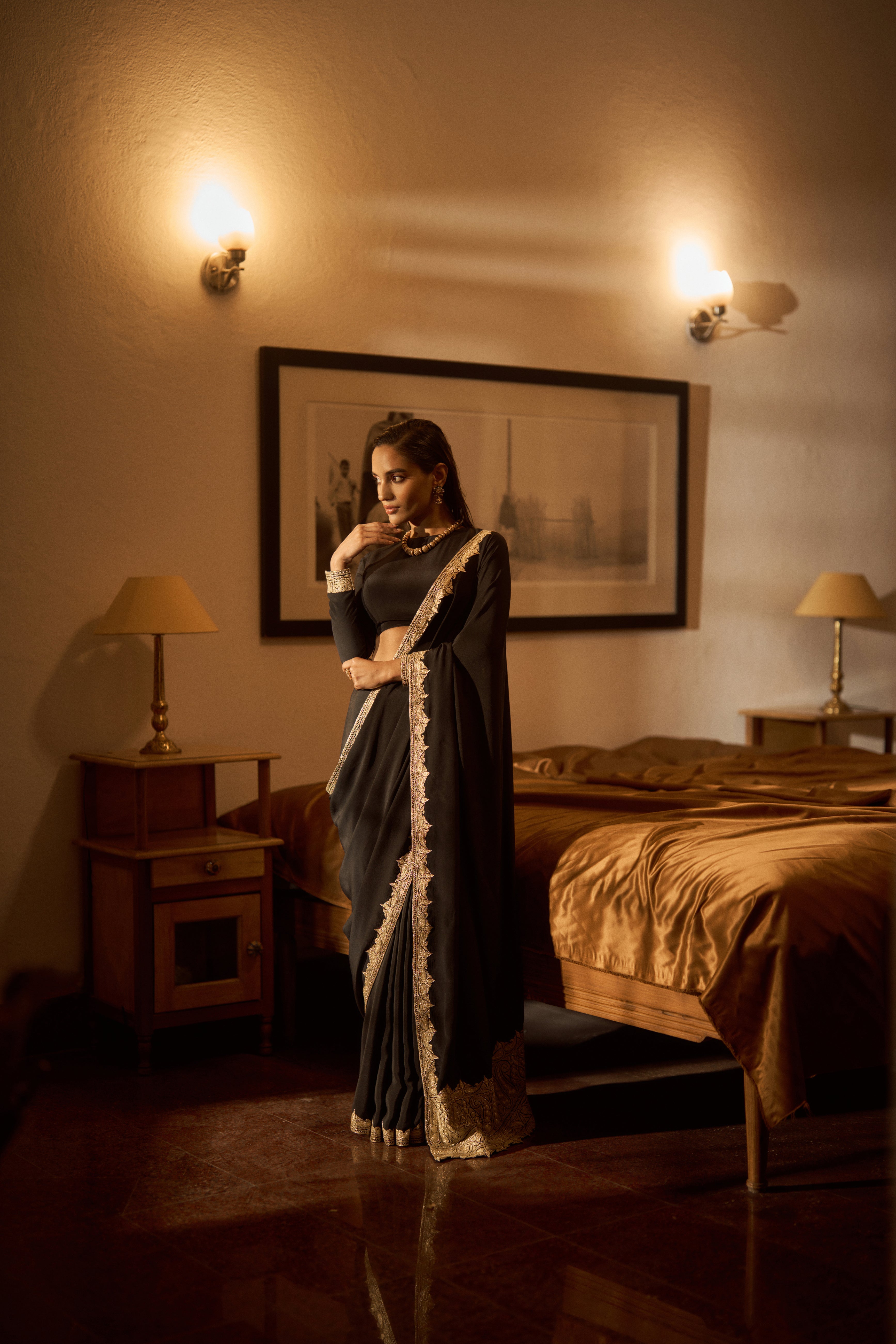 'Siddra' The one who is like a star. Black Siddra Saree hand embroidered with Kashmiri tilla work features paisley and chinar leaf border. It is worn with a matching hand embroidered full sleeve crepe silk blouse.