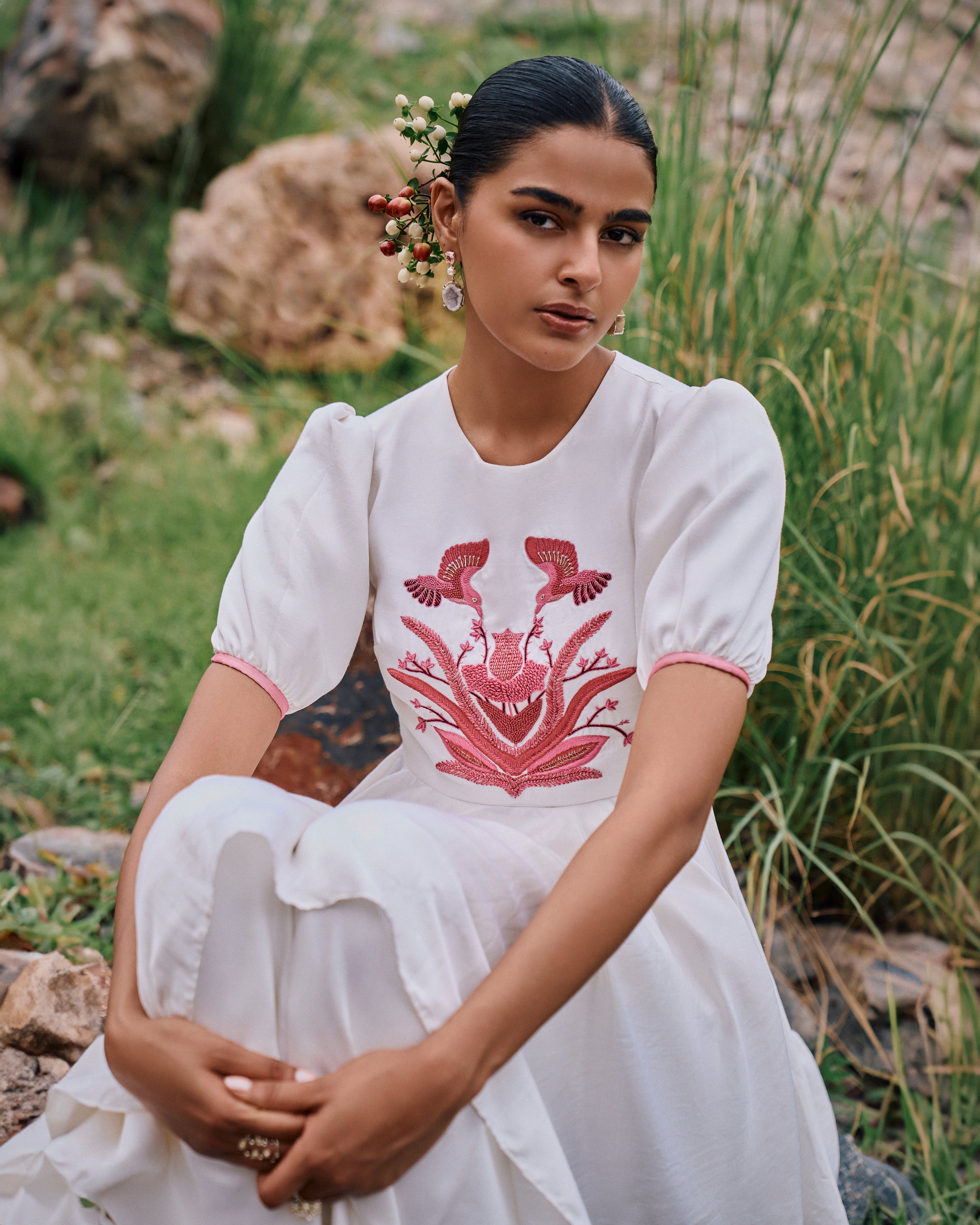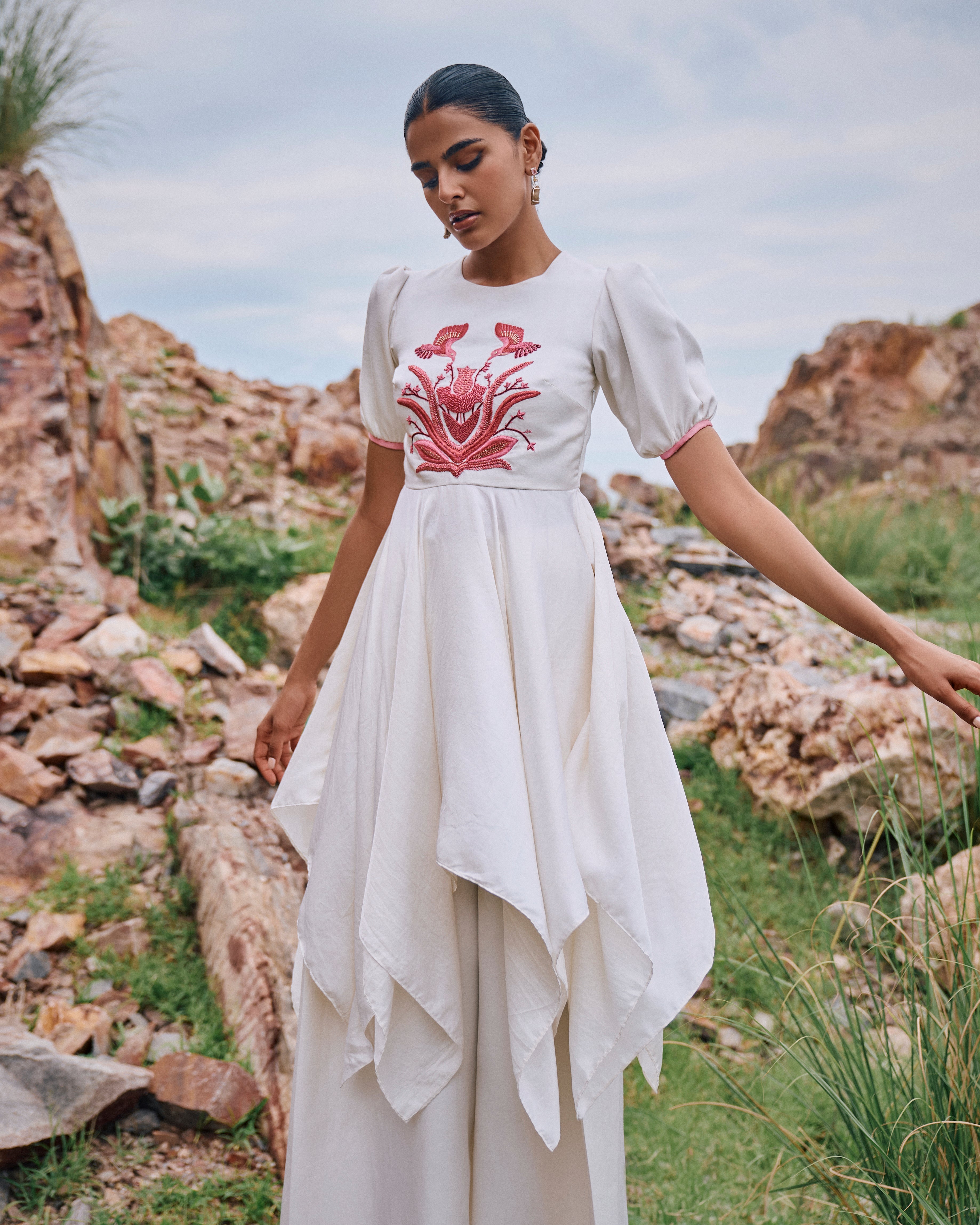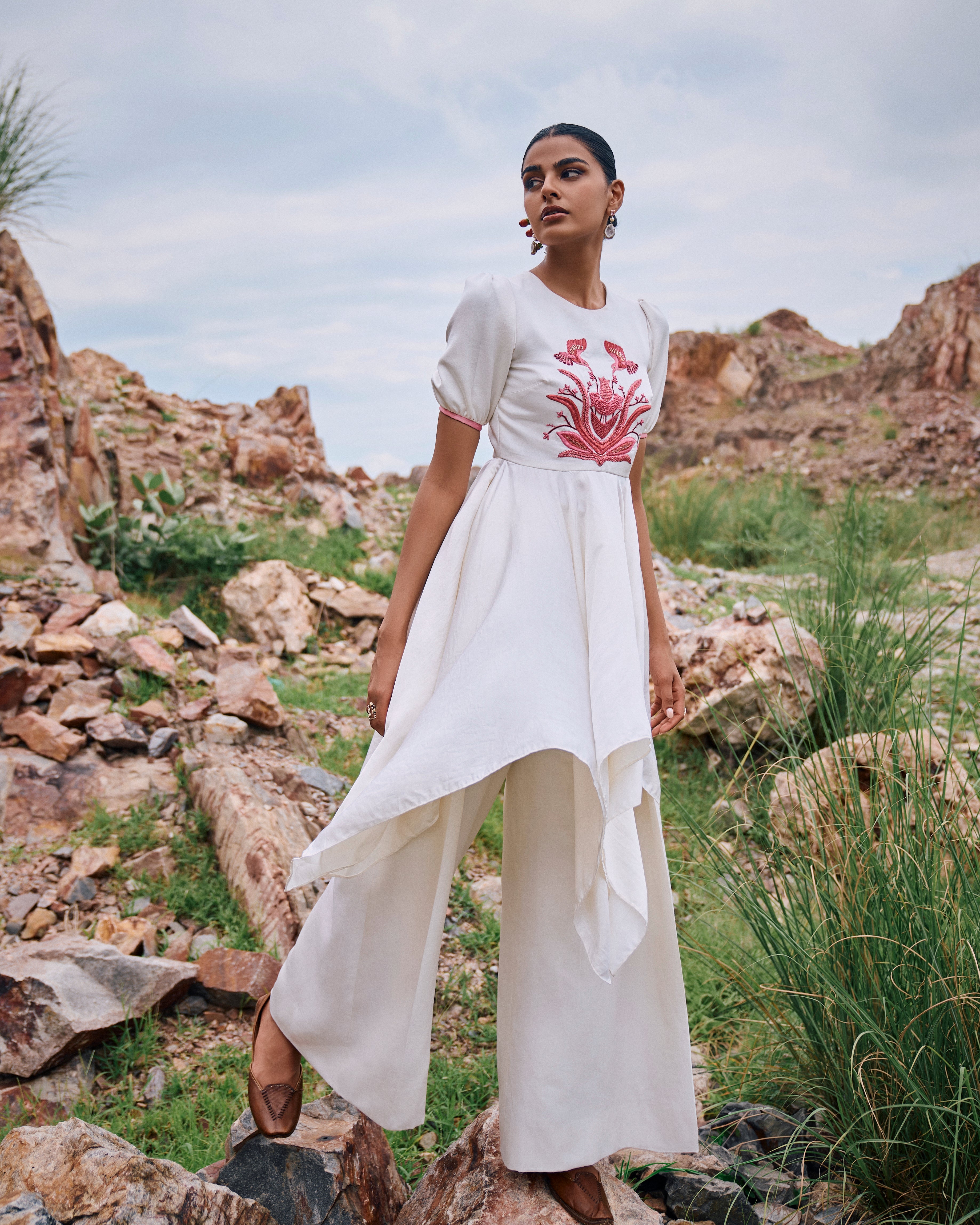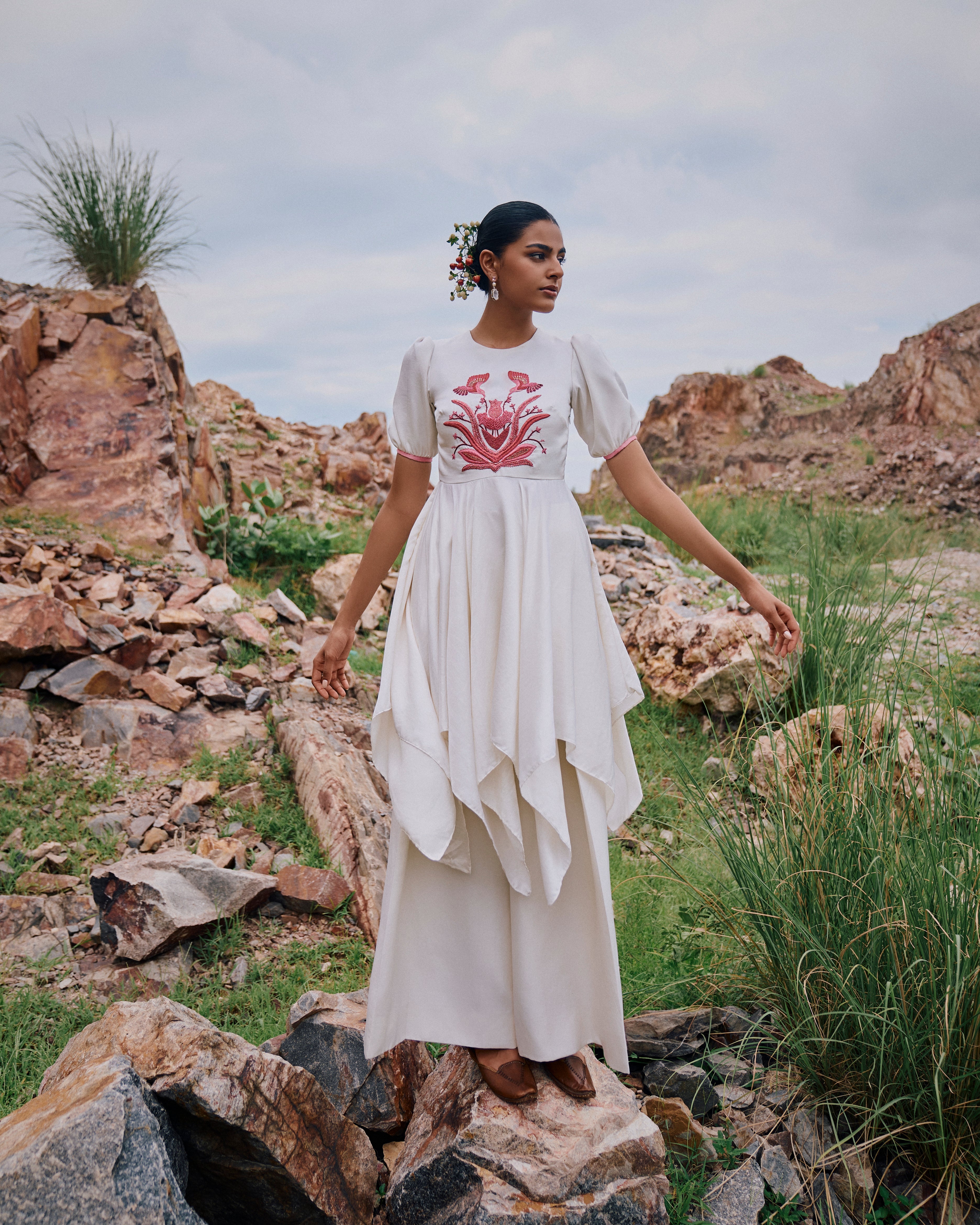 Puff sleeves High Low Satin Chiniya 'Sumukhi' kurta features hand embroidered Pink Bird Garden motif and is paired with matching 'Gadh' pants.