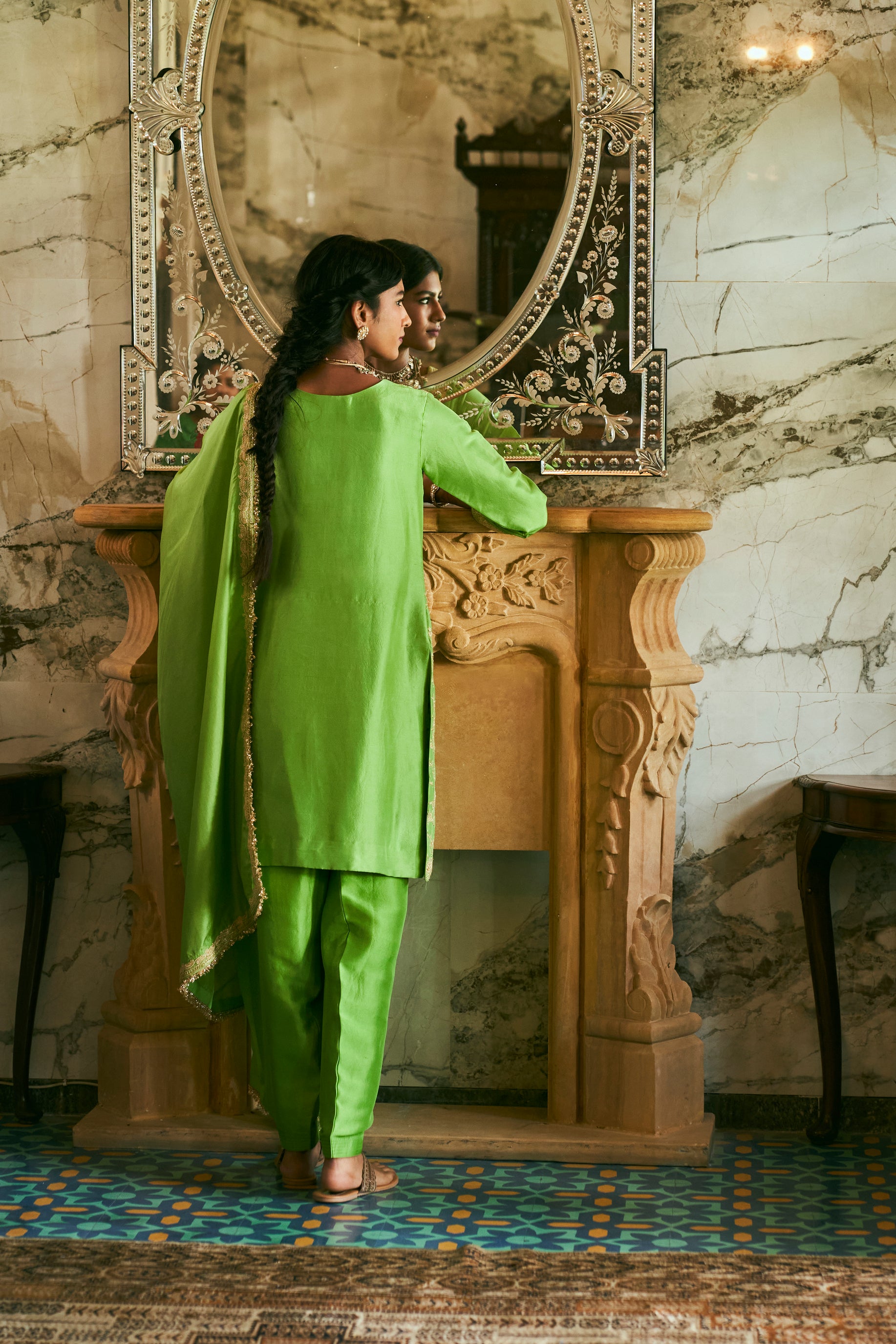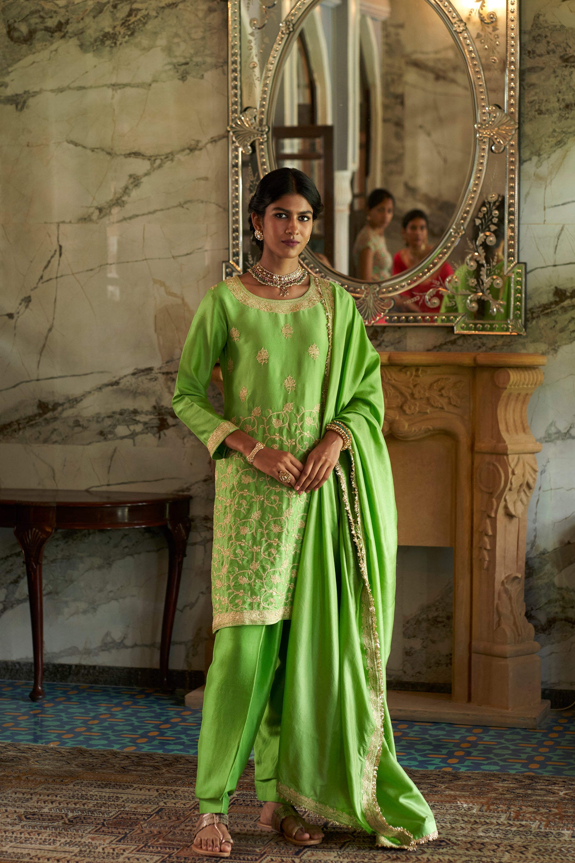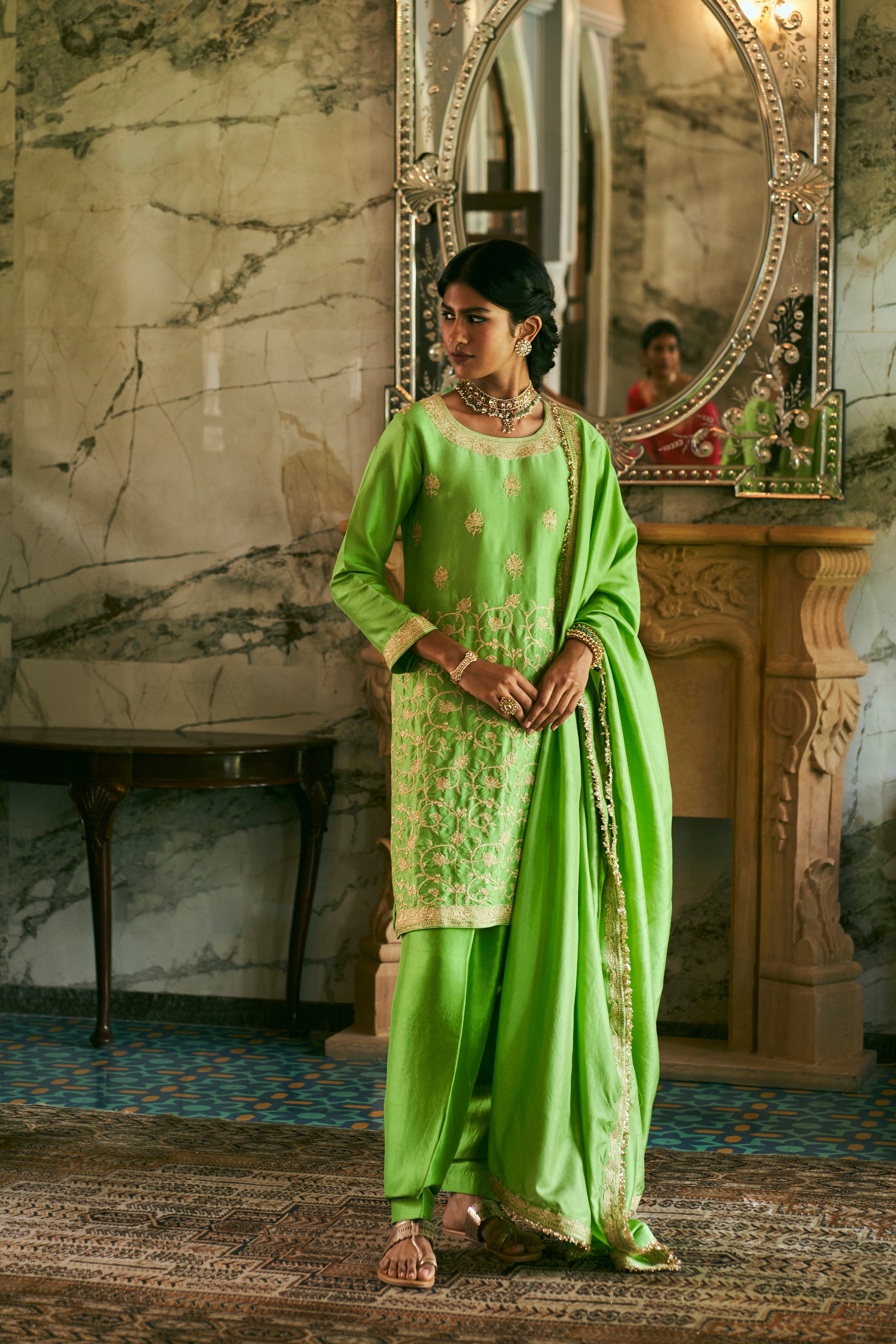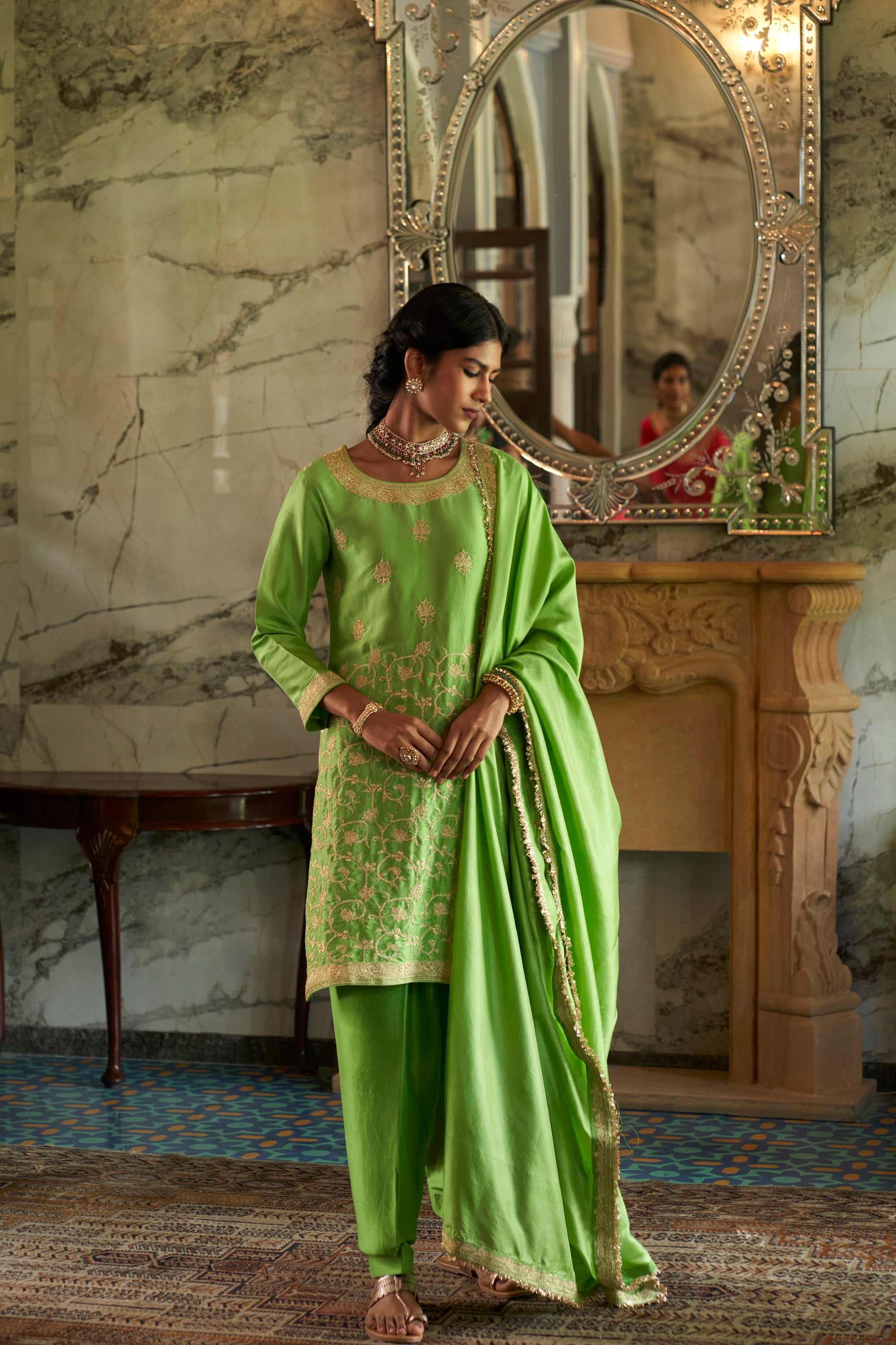 ‘Vanhi’ Lime green Kurta set crafted from Dupion Silk features beautiful floral jaal and punctuated with similar motifs. It is paired with matching hand Embroidered Lime green Dupatta.