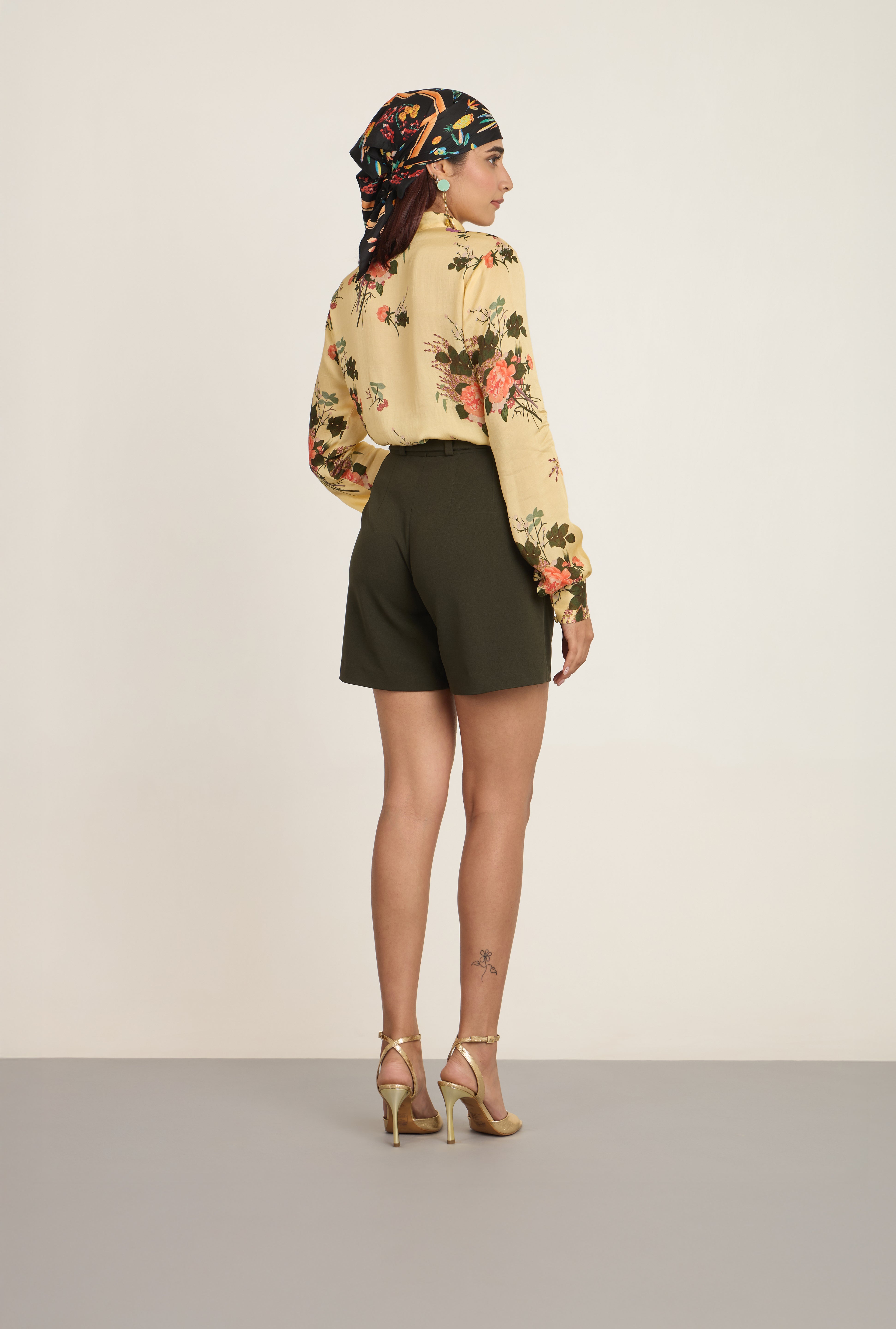 'Vera' yellow tie-neck floral printed shirt style top with Noam olive green mid rise shorts.
