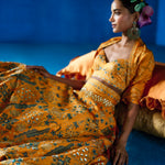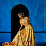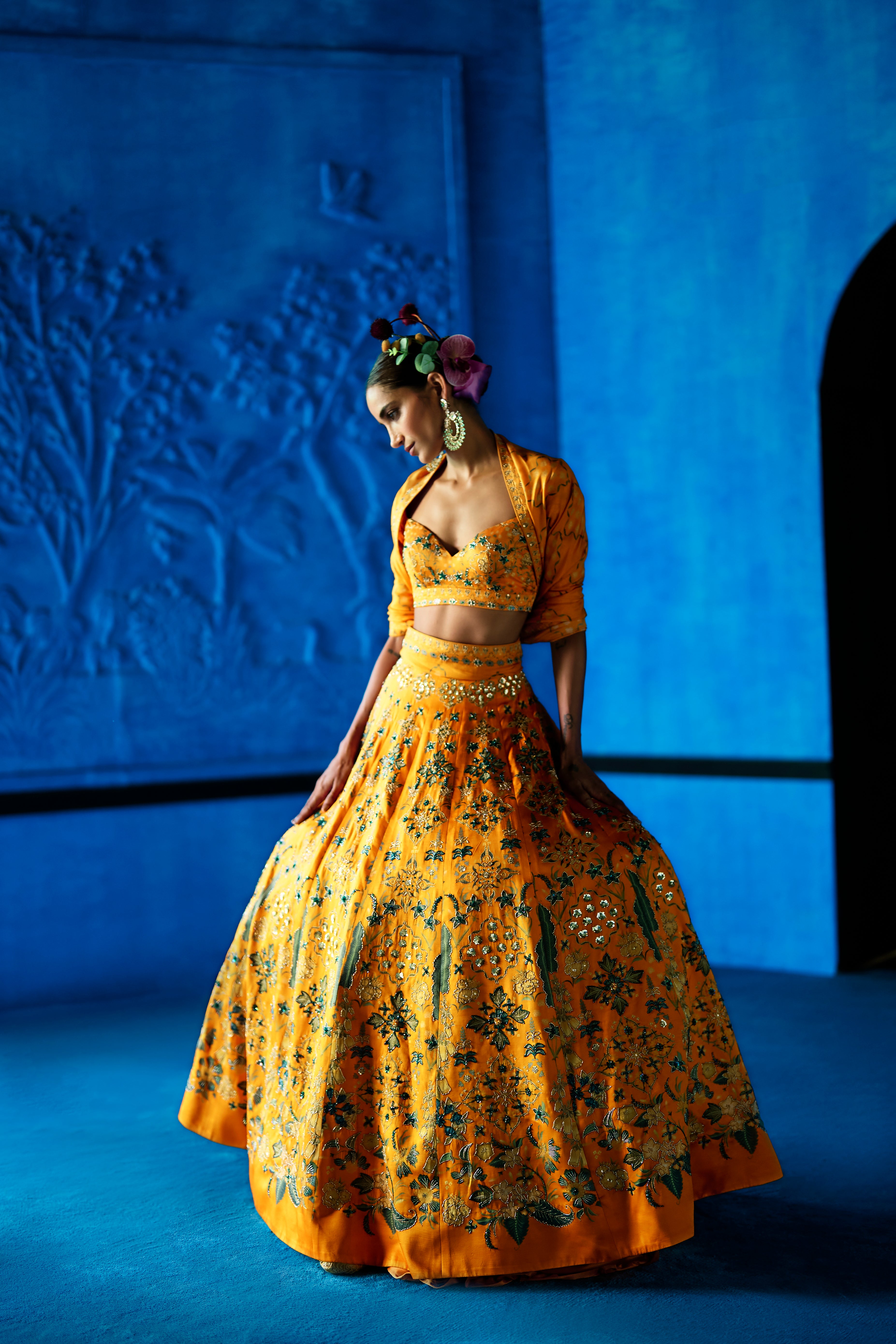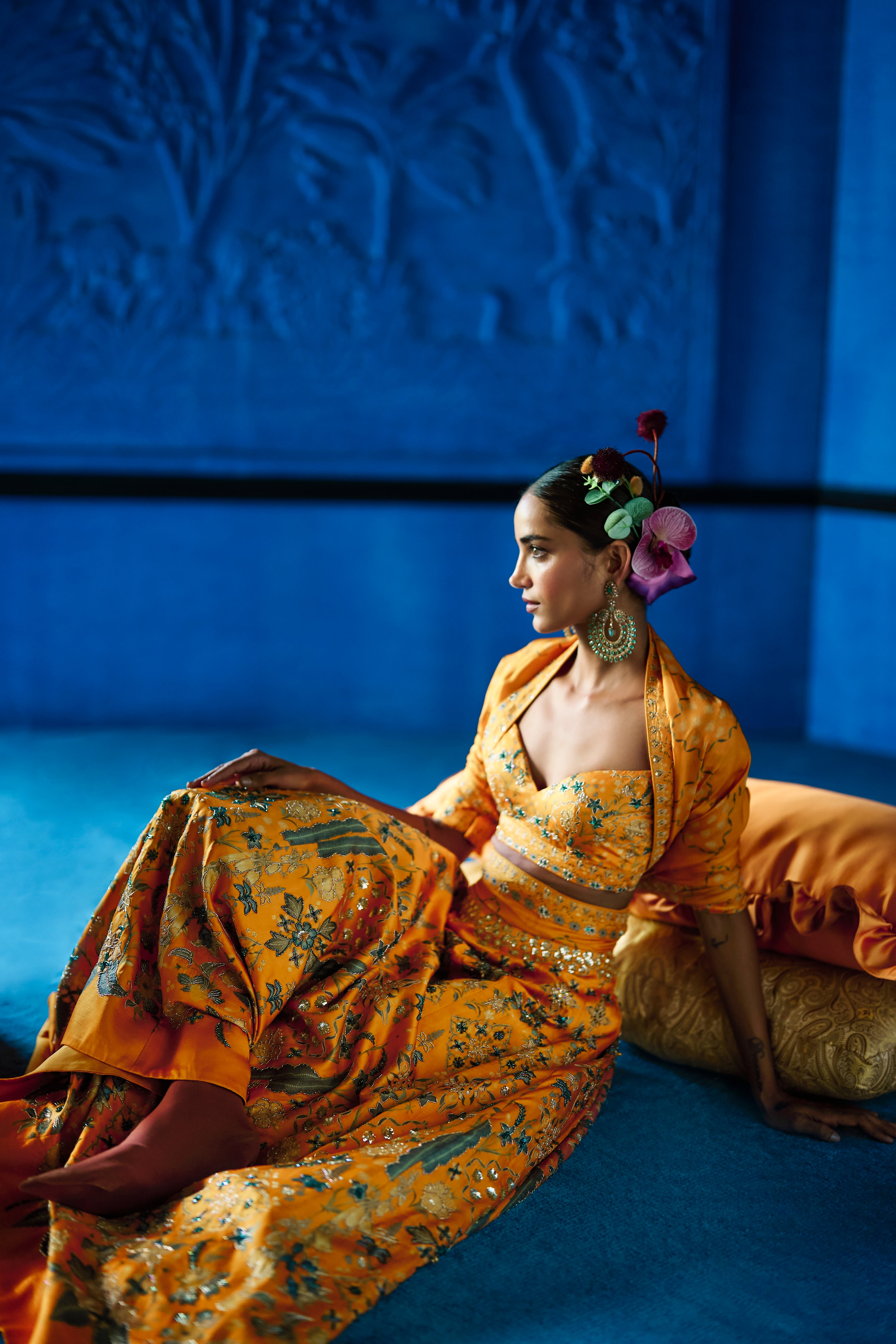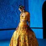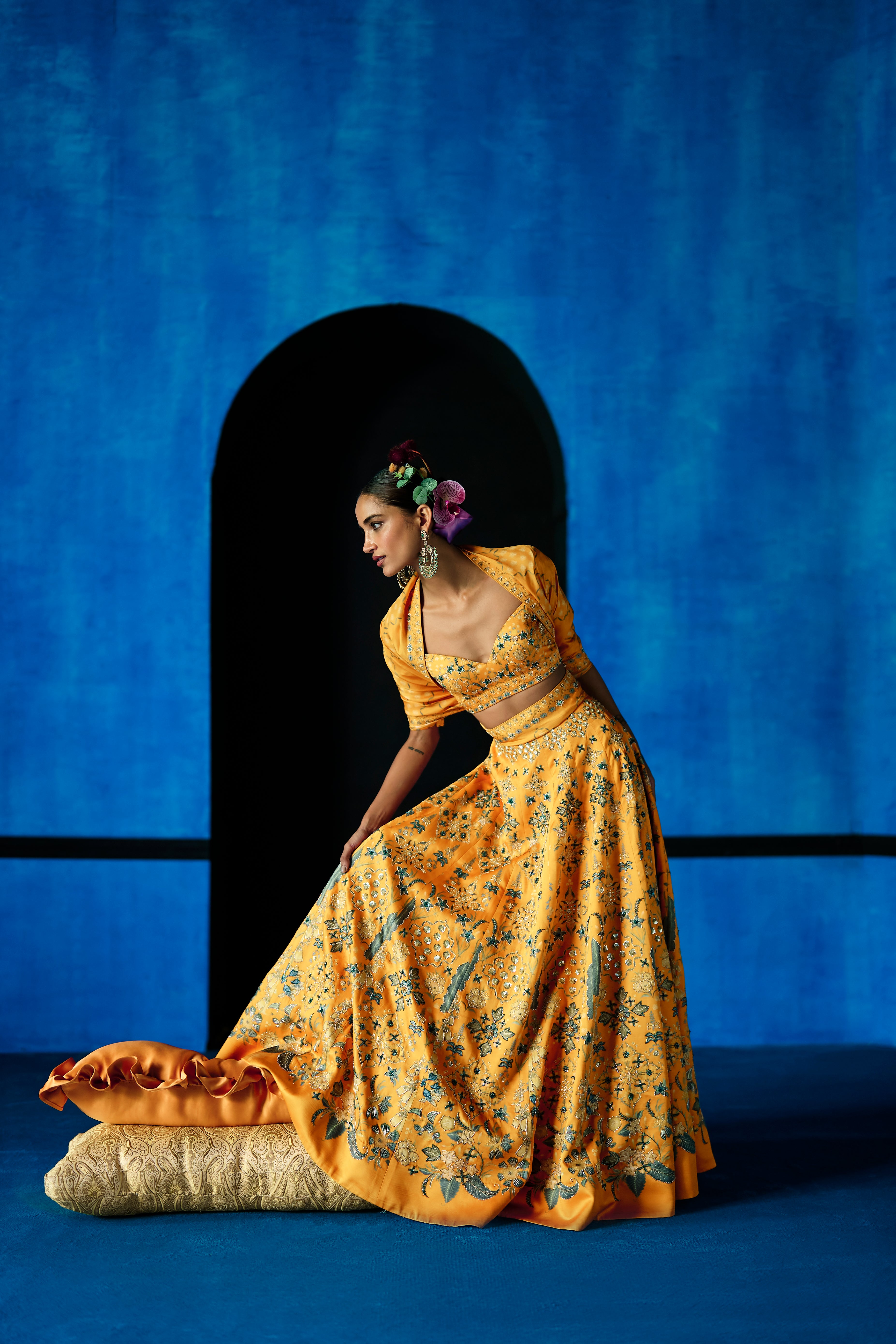 Yellow floral printed satin dupion lehenga hand embroidered with cutdana, beads and sequins. Paired with a heavily embroidered matching blouse with elbow sleeves and sweet heart neckline. Complemented with habutai dupatta edged with embroidery.