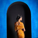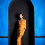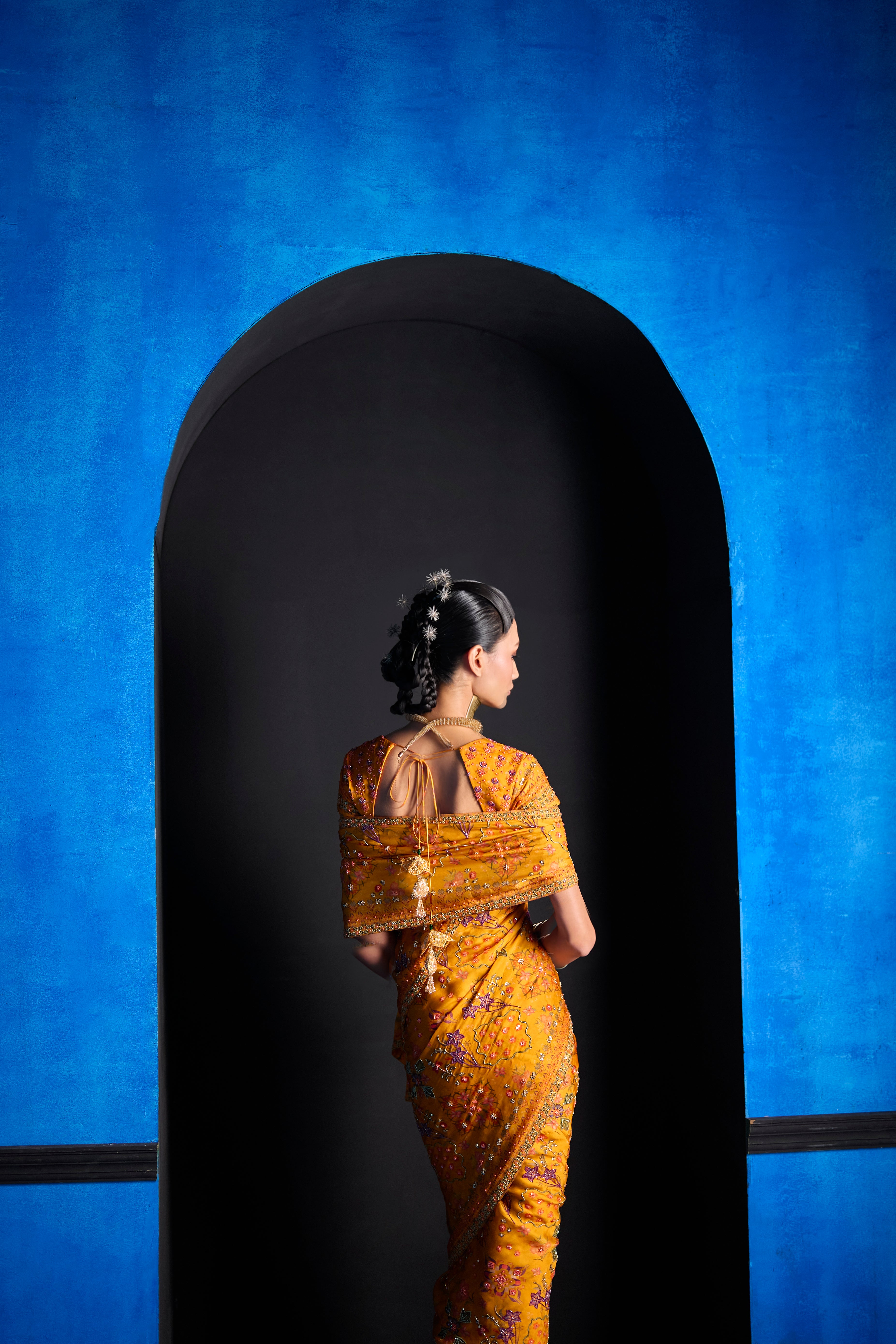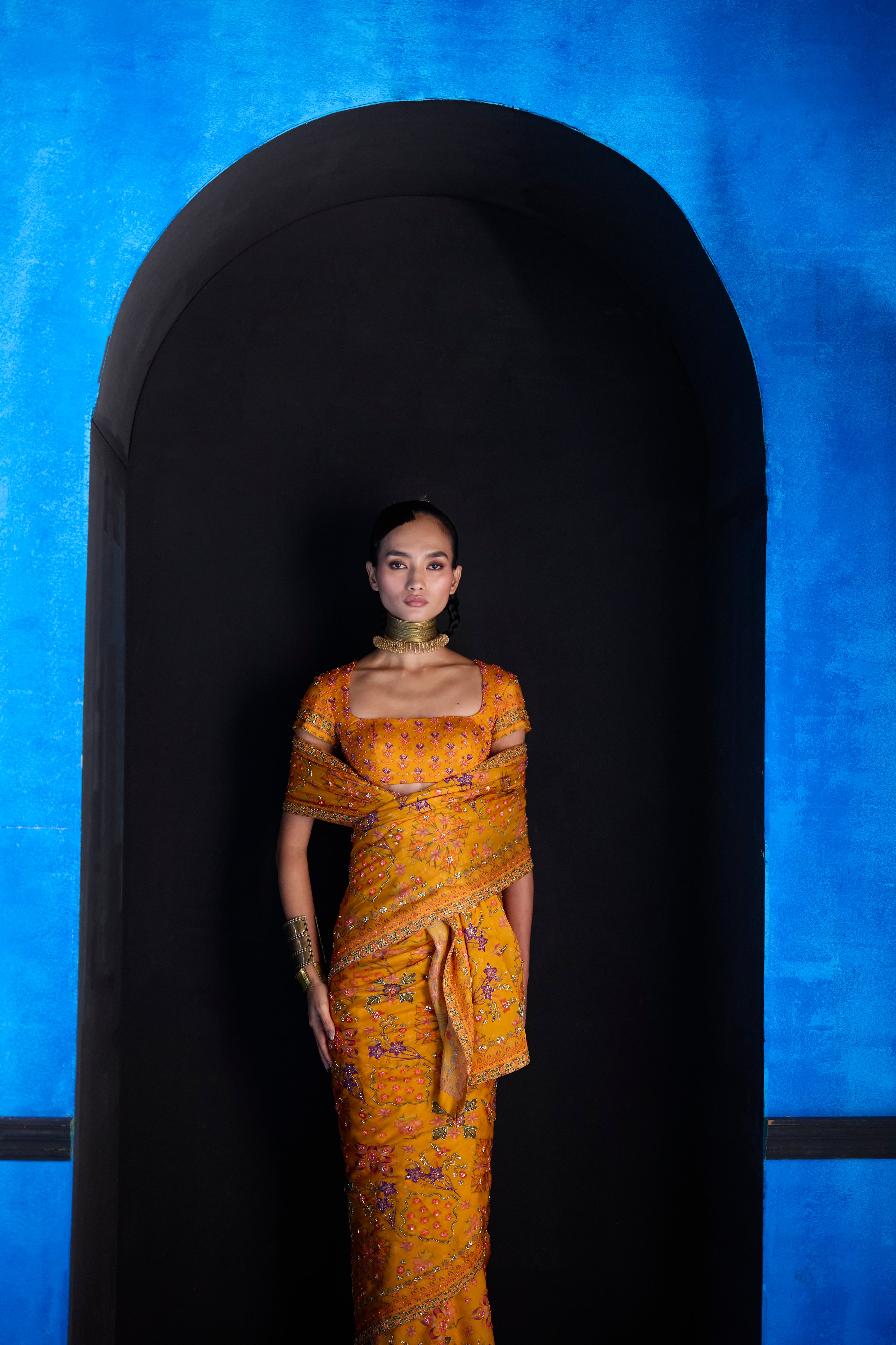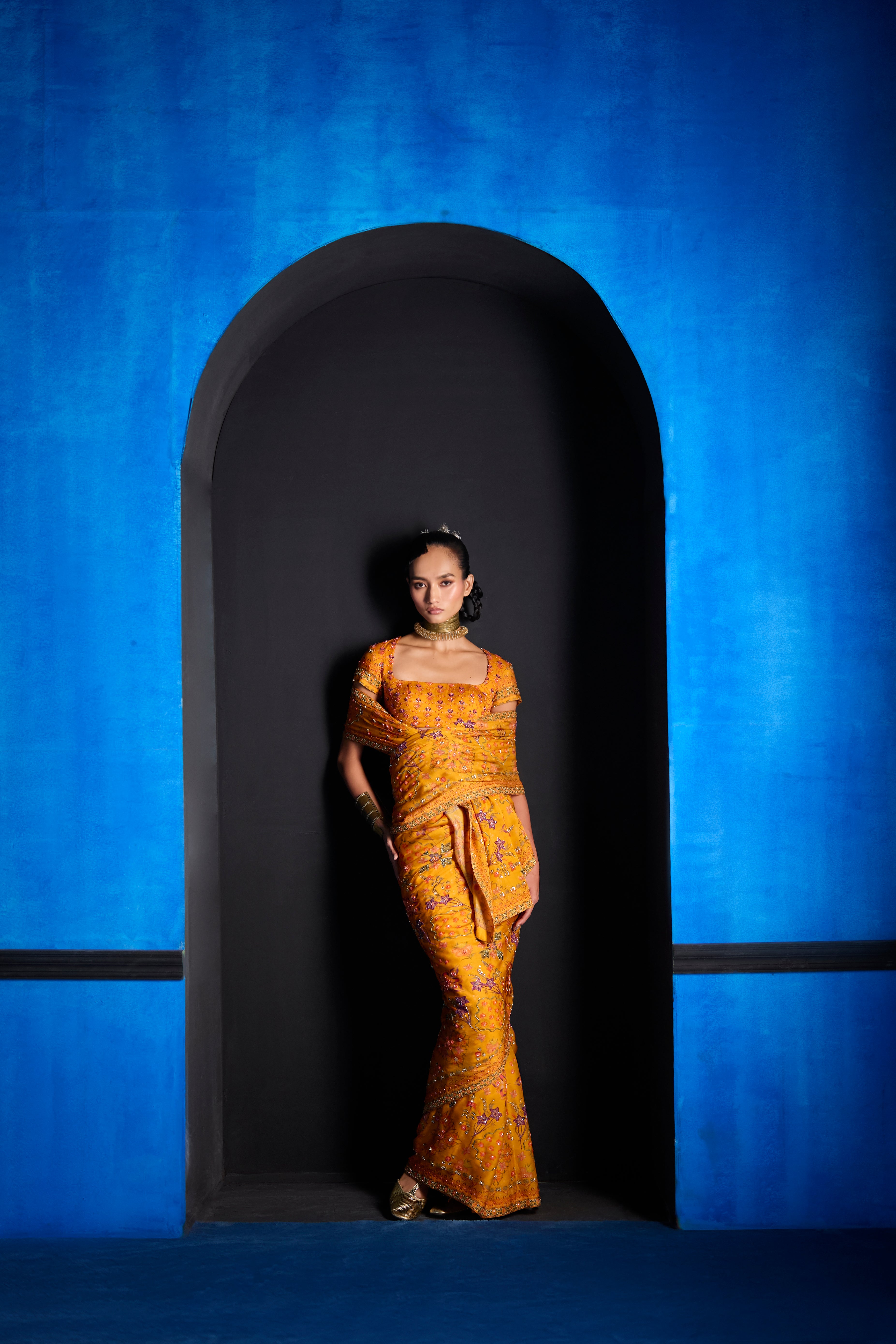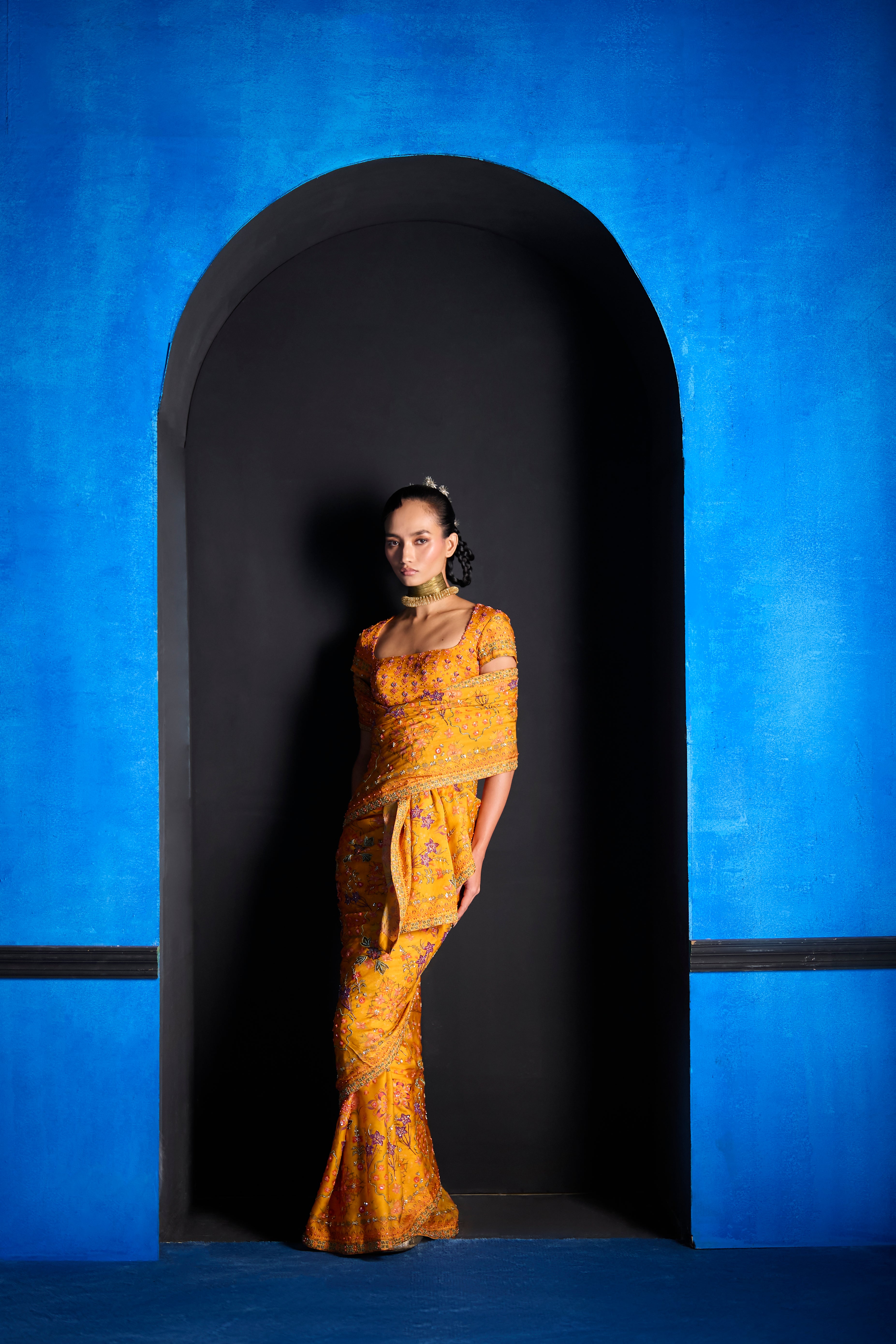 Yellow Floral Printed Satin Organza Saree hand embroidered with cutdana, beads and sequins. Paired with a matching floral printed embroidered blouse with wide square neckline and cap sleeves.