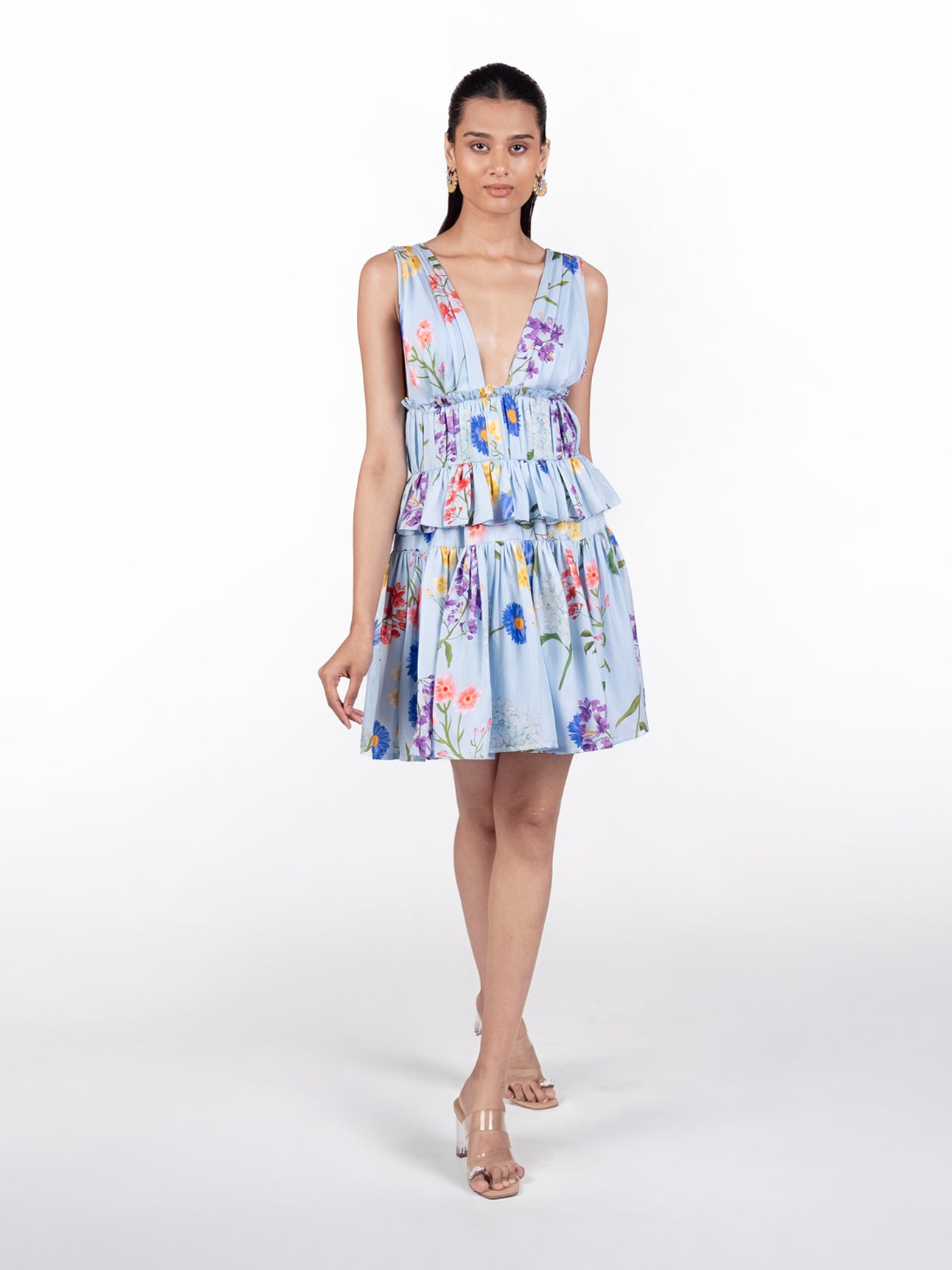 'Azira' light blue Floral Printed Sleeveless Mini Dress features V-neckline and layers.